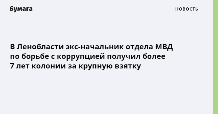 Суд в Ленобласти приговорил бывшего начальника отделения противодействия коррупции МВД по Лодейнопольскому району к 7 годам и 6 месяцам колонии строгого режима — по делу о получении взятки в крупном размере (п. «в» ч. 5 ст. 290 УК). Об этом сообщила пресс-служба СК.
