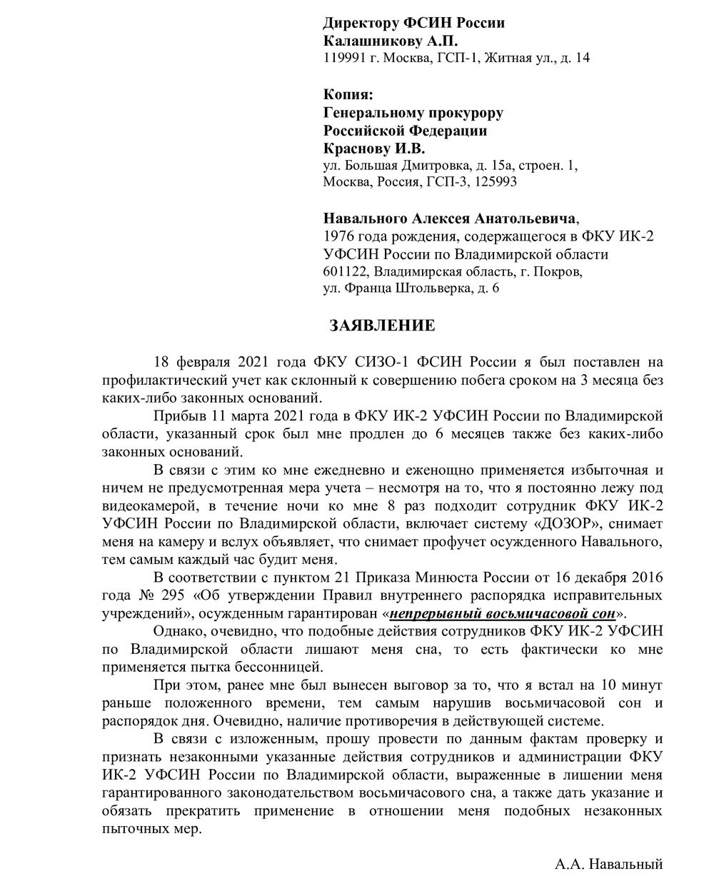 Представители Навального сообщили, что политик направил на имя генерального прокурора и ФСИН заявления, в которых потребовал обеспечить ему 8-часовой сон без перерывов, пожаловался на отсутствие должной медицинской помощи, а также попросил допустить своего врача, Алексея Баринова.