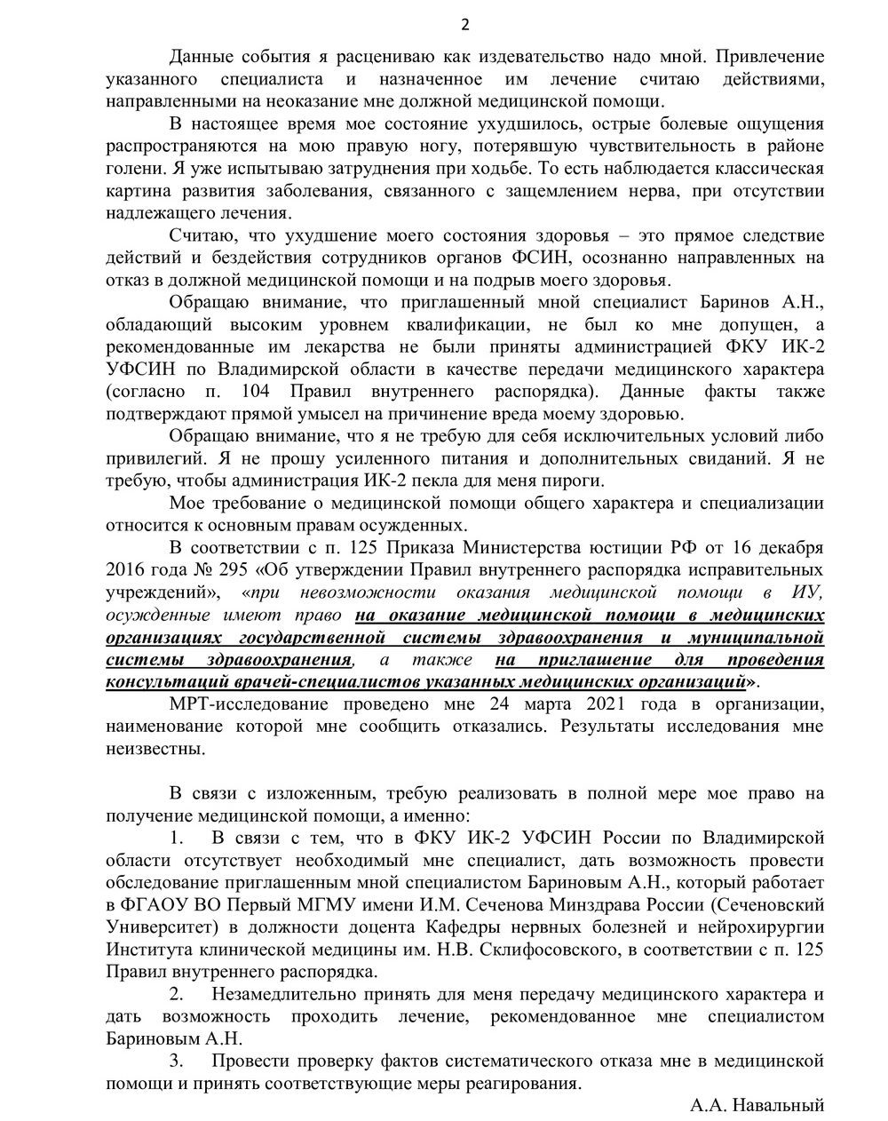 «Считаю, что ухудшение моего состояние — это прямое следствие действий и бездействия сотрудников органов ФСИН, осознанно направленных на отказ в должной медицинской помощи и на подрыв моего здоровья», — пишет Навальный в одном из заявлений.