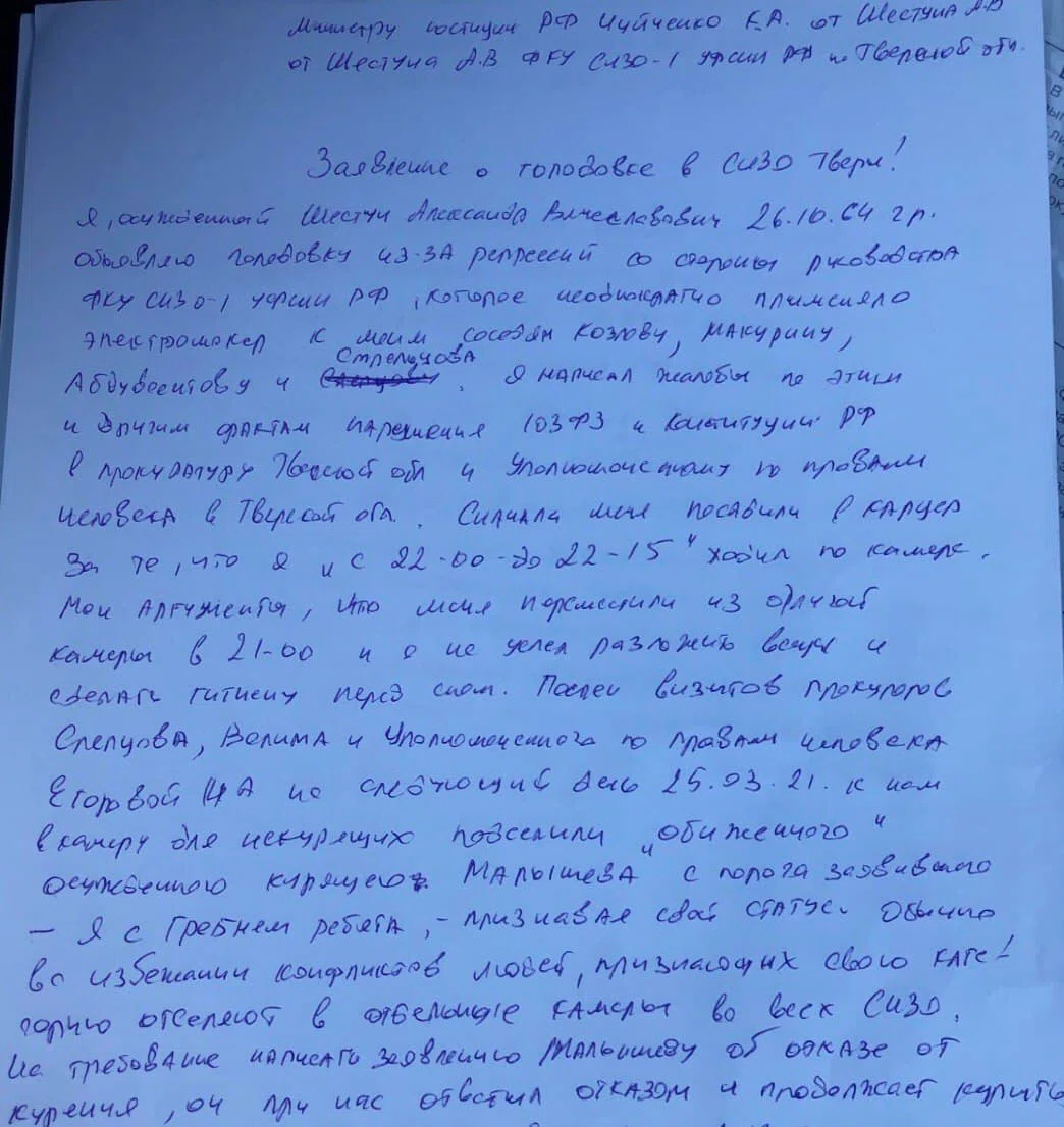 Шестуна накануне, 24 марта, посетили прокуроры с целью опросить его в рамках поданных жалоб, у него побывала Уполномоченный по правам человека в Тверской области Надежда Егорова, которой он также рассказал о нарушении прав заключенных в СИЗО-1.