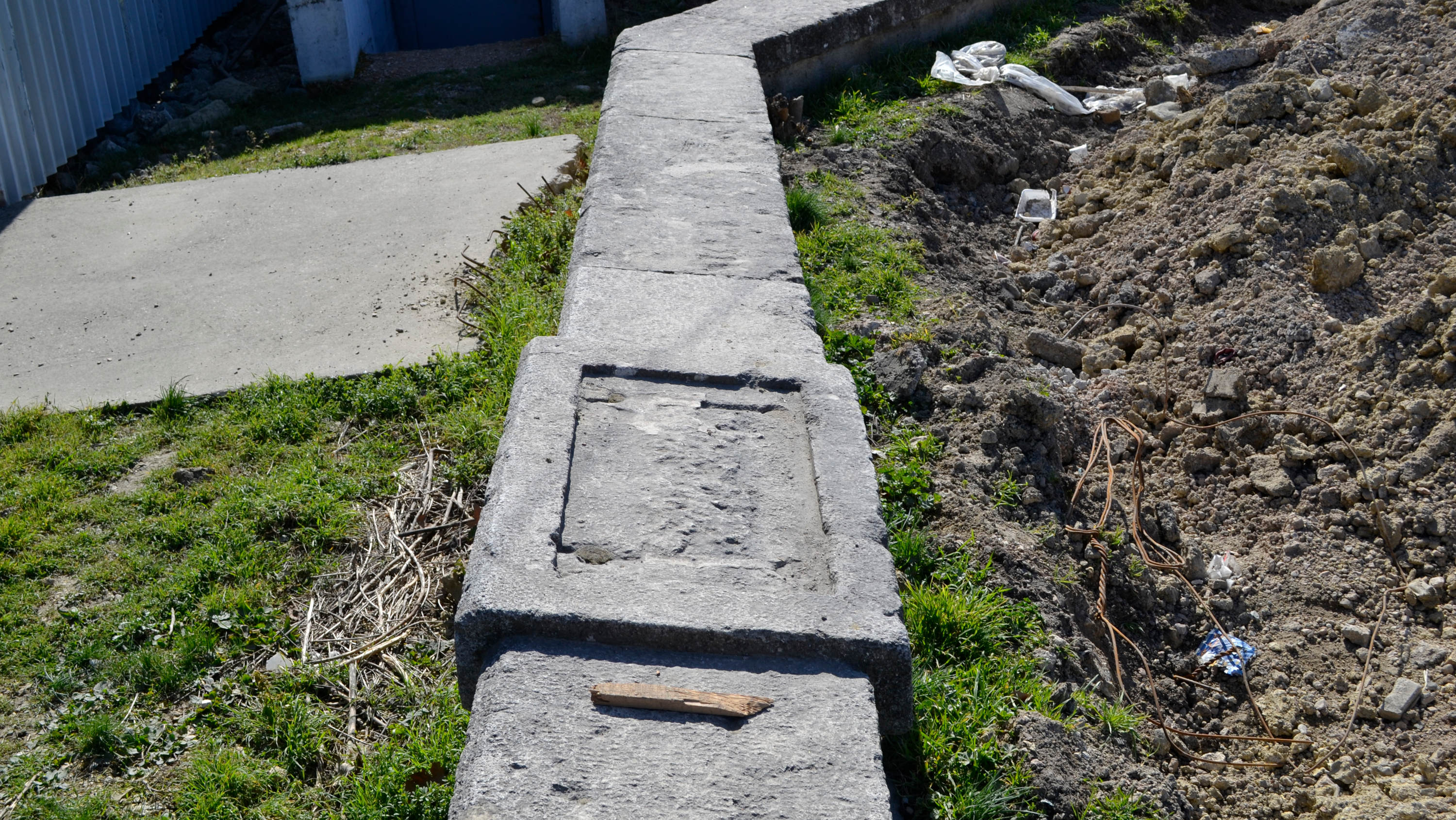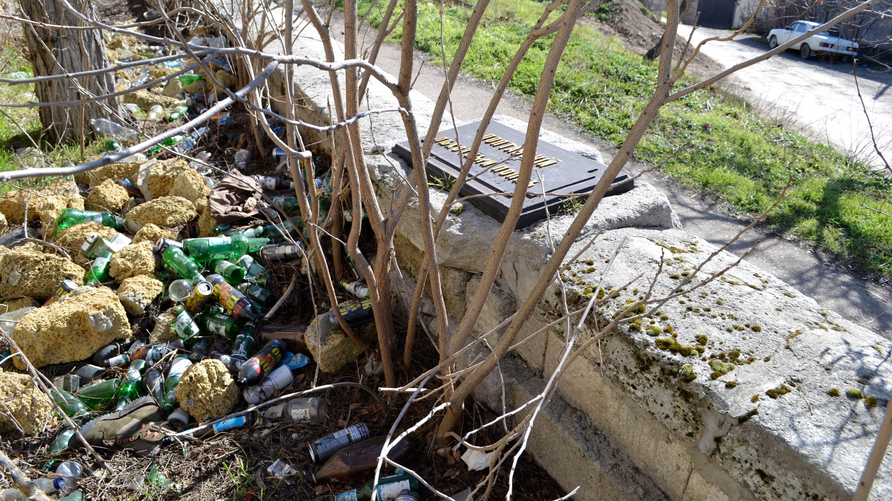 Напротив двора мемориальная стенка пробирается сквозь хаос из металла, досок и камней. Части мемориального объекта здесь нет, как раз там, где куча обломков известняка. Как будто кто-то въезд планировал сделать.