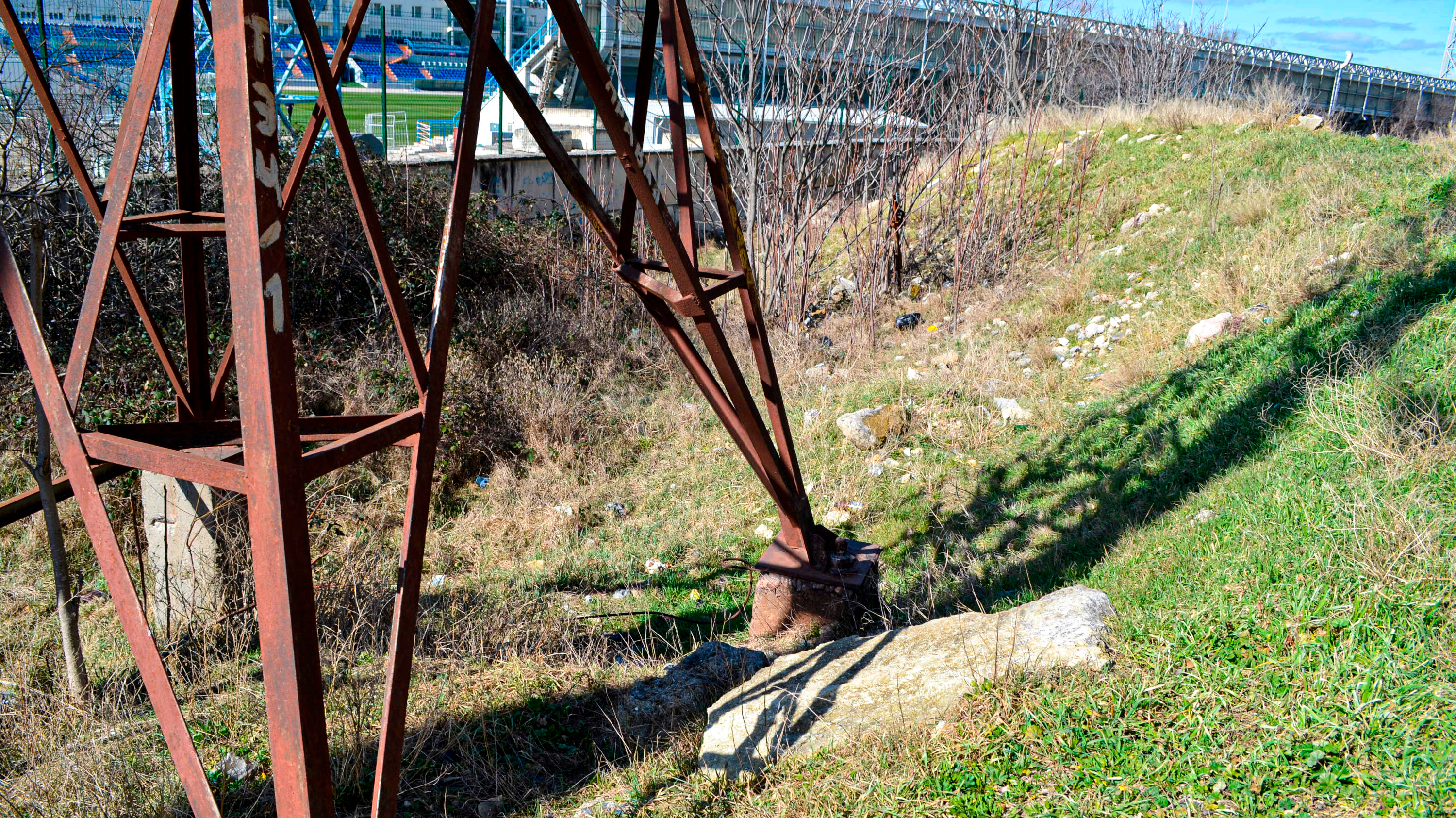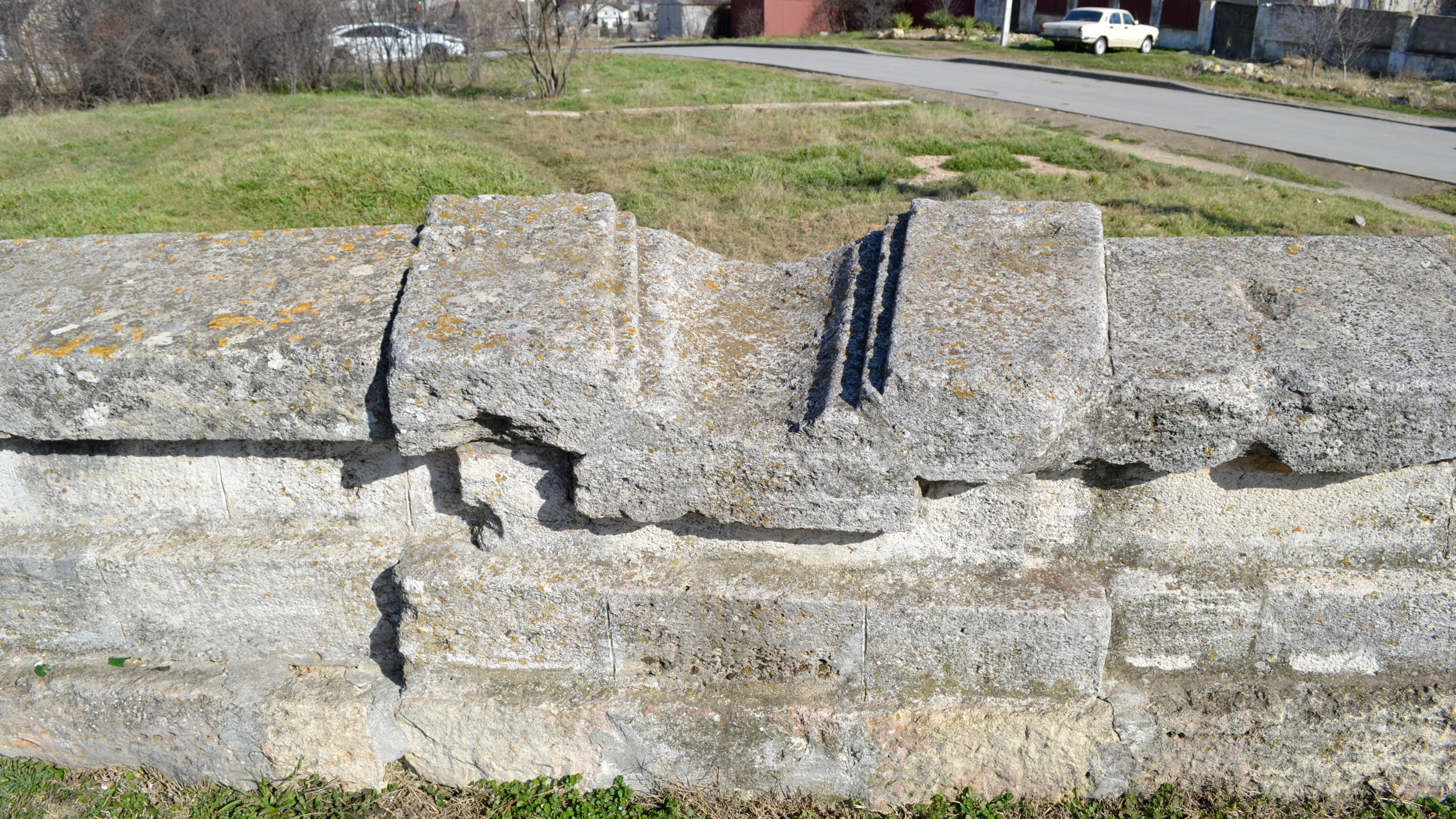 Чуть ниже на восточном склоне, прямо под опорами мачты ЛЭП, из земли торчат обломки камней и блоков, возможно, служивших ранее элементами мемориальной стены.