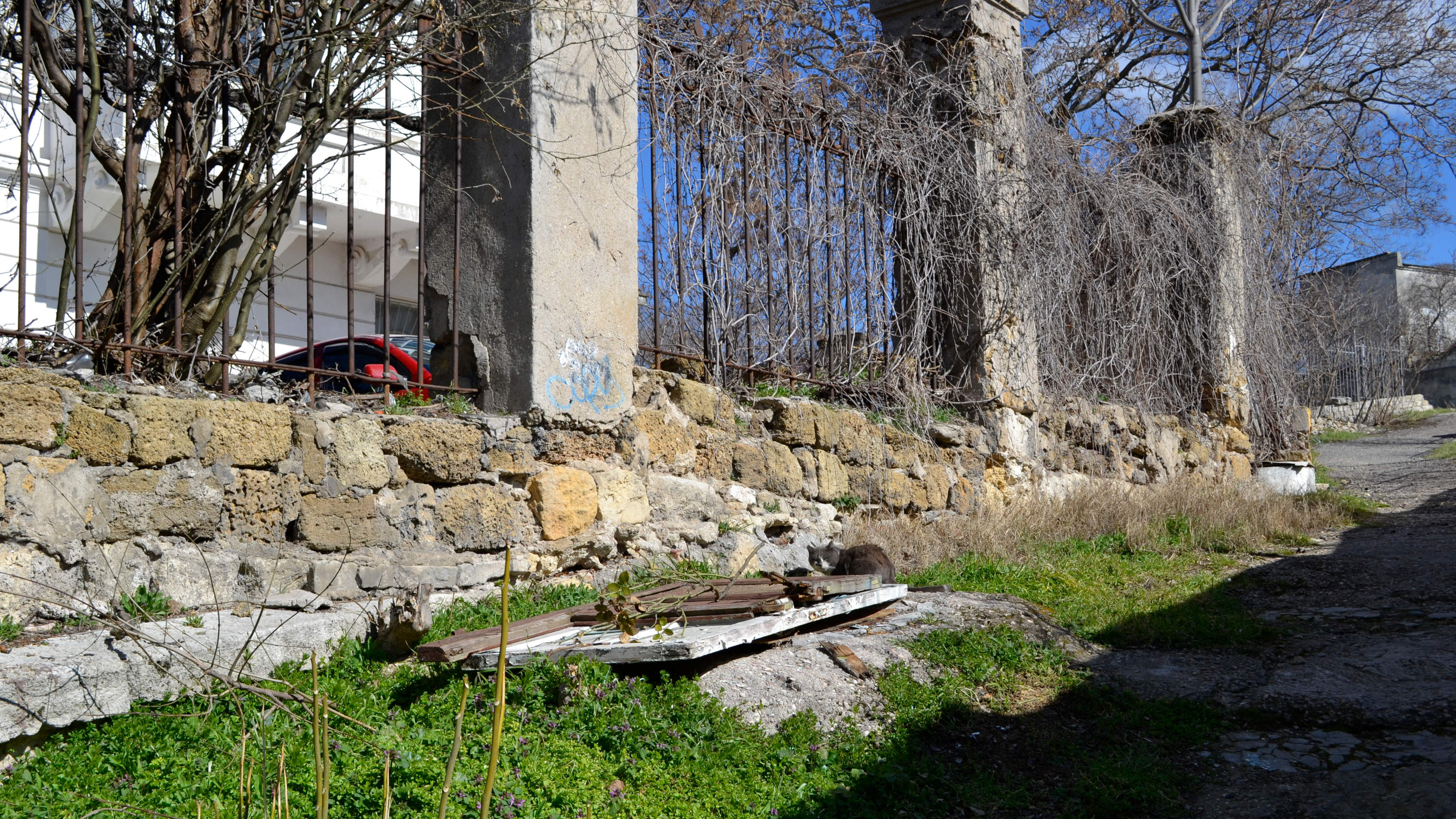 Через 10 метров стена обрывается и продолжается уже с противоположной стороны улицы Жерве. Улица названа в честь Петра Любимовича Жерве (1837-1907) – участника первой обороны Севастополя, командира батареи, сооруженной между Малаховым курганом и 3-м бастионом над склонами Докового оврага.