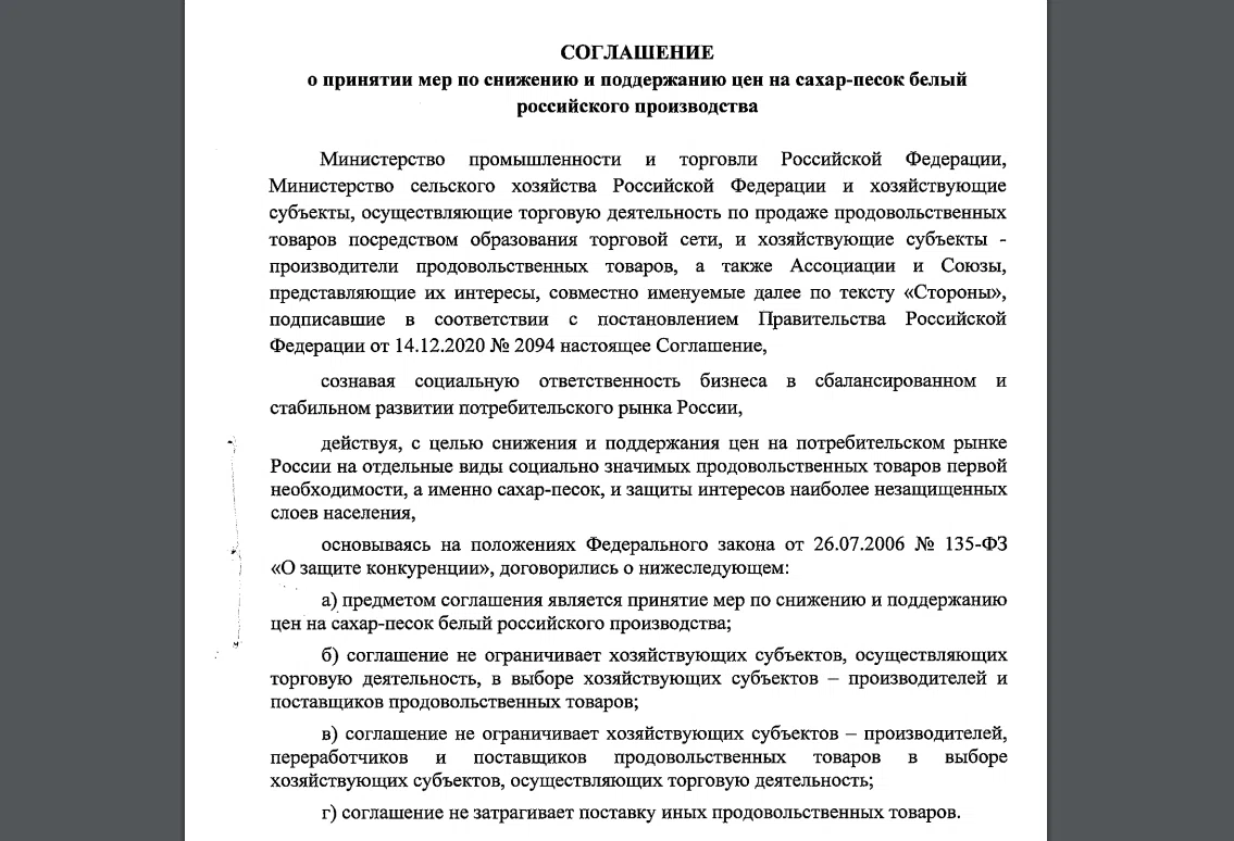 Более трех месяцев назад, 14 декабря 2020 года, Минпромторг (Мантуров), Минсельхоз (Патрушев-мл.), производители сахара и подсолнечного масла, а также ретейлеры подписали соглашение («Новая» располагает его копией) «о принятии мер по снижению и поддержанию цен» на сахар-песок белый отечественного производства.