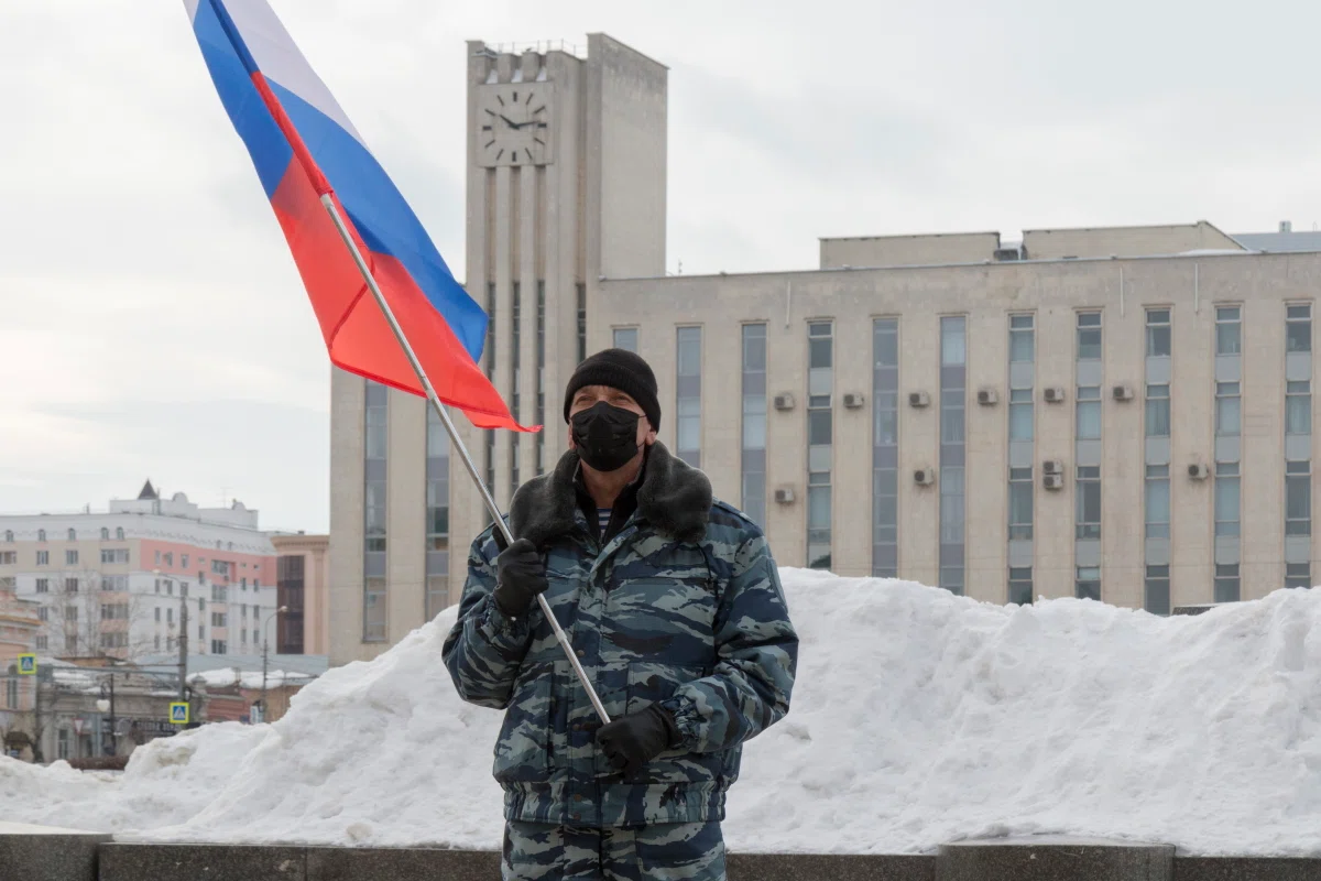 Напротив дверей администрации встает мужчина с российским флагом. Представляется Геннадием Геннадьевичем. Выступает: «Я стою в поддержку нашего губернатора Белозерцева. Мы живем в России, он — россиянин, я — россиянин, поэтому я здесь с флагом».