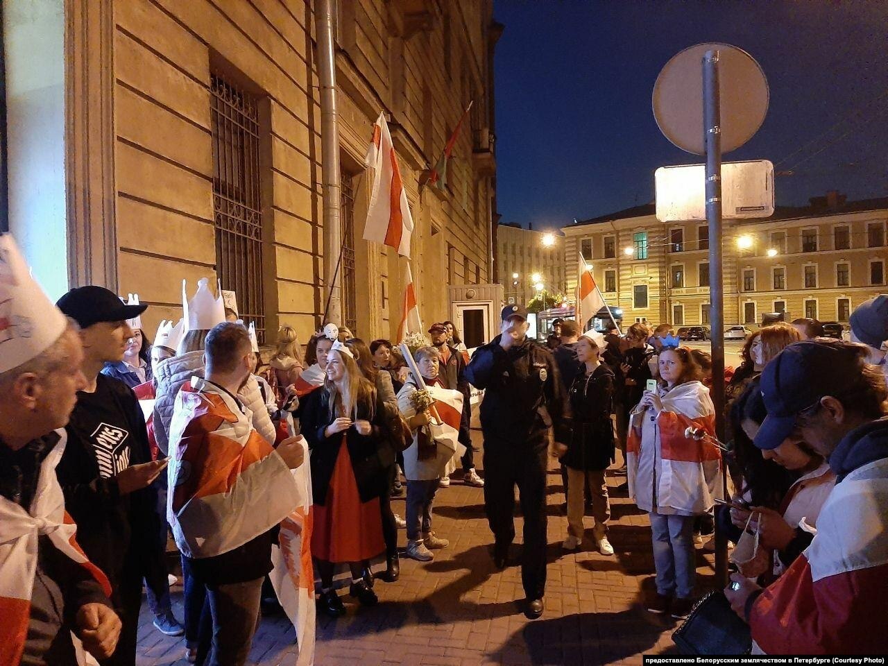 - В Петербурге граждане Беларуси собирались в течение нескольких месяцев около консульства в знак поддержки протестующих в республике. Долгое время полиция не препятствовала их акциям, но в середине декабря 2020 года задержала 14 человек около консульства Беларуси. Полицейские требовали, чтобы участники мирной акции убрали протестную символику – бело-красно-белые флаги. После задержания протестующие перестали собираться около консульства.
