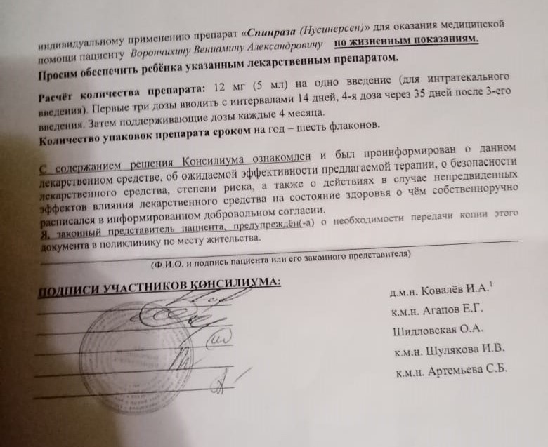 – 11 февраля Анна Ворончихина выписала на меня нотариально заверенную доверенность, чтобы я мог представлять их с сыном интересы в судах, больницах, в любых обращениях в госорганы. Я прилетал в Красноярск 18 февраля и тут же – в краевую больницу. 17 февраля Анна с сыном еще находились там, но их начали срочно готовить к выписке. Анна просила главного врача оставить их в больнице еще на день, чтобы я смог посмотреть Вениамина. Главврач ответил: "Нет, мы не можем", созвонился с паллиативной службой, и их в экстренном порядке увезли в Кольцово. Анна успела до отъезда домой оставить доверенность на меня. Благодаря этому 18 февраля я уже на основании ее доверенности встретился с главврачом краевой детской больницы и бывшим министром здравоохранения края Яниным, от которого узнал, что закупка Спинразы еще не произведена, а только планируется (с московской ВК прошло уже пять(!) месяцев). Он же предъявил мне ВК края с назначением Спинразы по жизненным показаниям, датированную днем ранее – 17 февраля. Возможно, и ее бы не было, если бы они не знали, что 18-го прилечу я. Янин на словах мне сообщил, что Спинразу введут "максимально быстро". Однако спустя почти полмесяца это так и не произошло: 3 марта в районной больнице Ачинска у Вениамина в отсутствие лечения происходит остановка дыхания. Его реанимировали, – вспоминает Курмышкин. – Я срочно пишу Янину (скриншоты переписки есть в распоряжении редакции), он отвечает, что Вениамина экстренно переведут в Красноярск для введения Спинразы: "Ждем отгрузки и доставки через пять дней, сразу заберем для терапии".