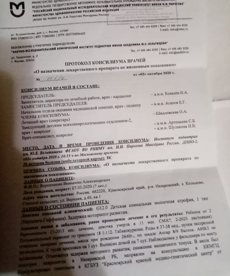 – Вообще врачи молодцы, думаю, они и раньше бы диагноз Вене поставили, но мы только в сентябре в первый раз попали в краевую больницу – до этого из-за пандемии нам не разрешали выезды с ребеночком по больницам. В краевой мы полностью прошли обследование: врач, который нас наблюдал, отправил все результаты, анализы на врачебную комиссию специалистам в Москву. Там собрали консилиум, который одобрил нам предоставление этого дорогостоящего препарата. 2 октября мне уже пришло письмо с Москвы с заключением врачебной комиссии (ВК) о необходимости срочно ставить Спинразу (вернее, письмо пришло в краевую больницу, там мне копию сделали и отправили по месту жительства). Если раньше, еще год назад, родители детей с СМА часто жаловались на протяжки в этом деле, сложности, чтобы пробиться на ВК в столицу – нам грех жаловаться, с этим все прошло гладко. Так что надежда была самая реальная. Мы уже перекрестились и выдохнули.
