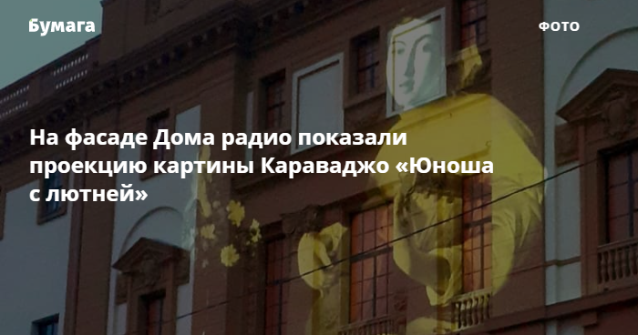 На фасаде Дома радио в Петербурге 26, 27 и 28 марта показывали проекцию картины Караваджо «Юноша с лютней». Анимированный портрет постепенно трансформировался в другую работу — «Лютниста» китайского художника Чжан Хуаня. Мэппинг сопровождался музыкой, которую подготовили коллектив musicAeterna и саунд-артист Дмитрий Мазуров.