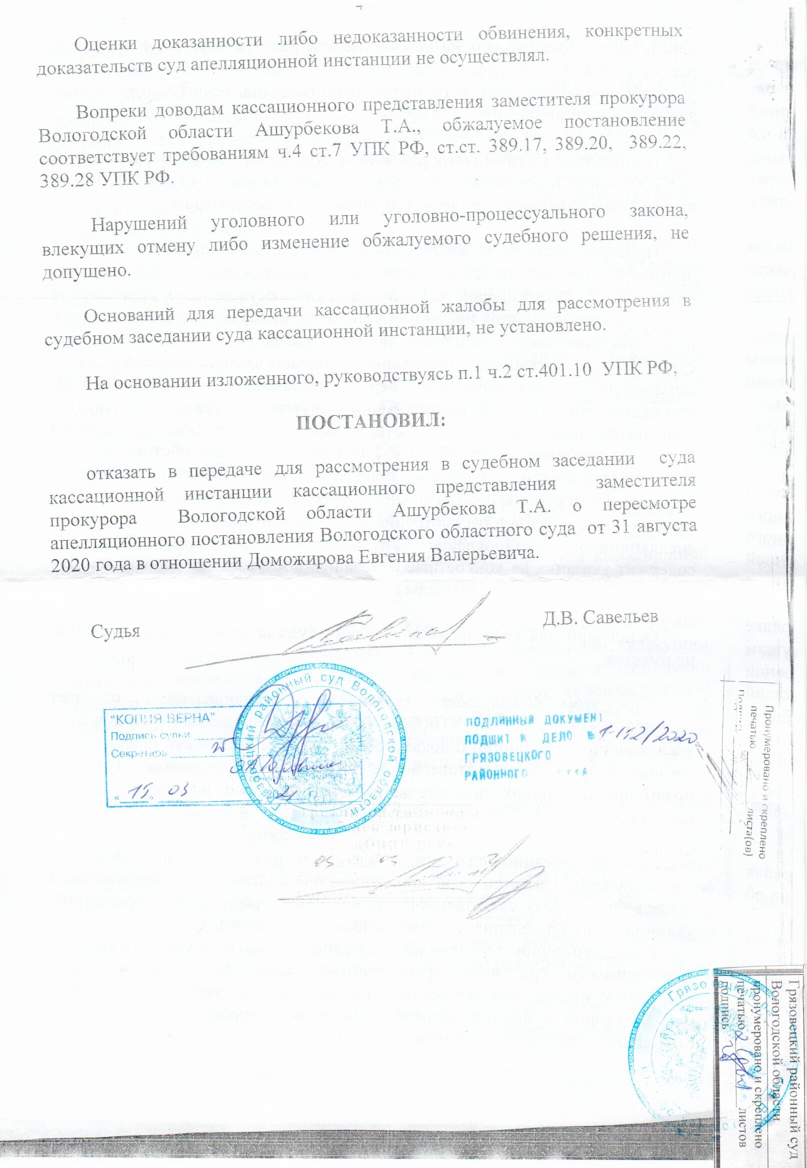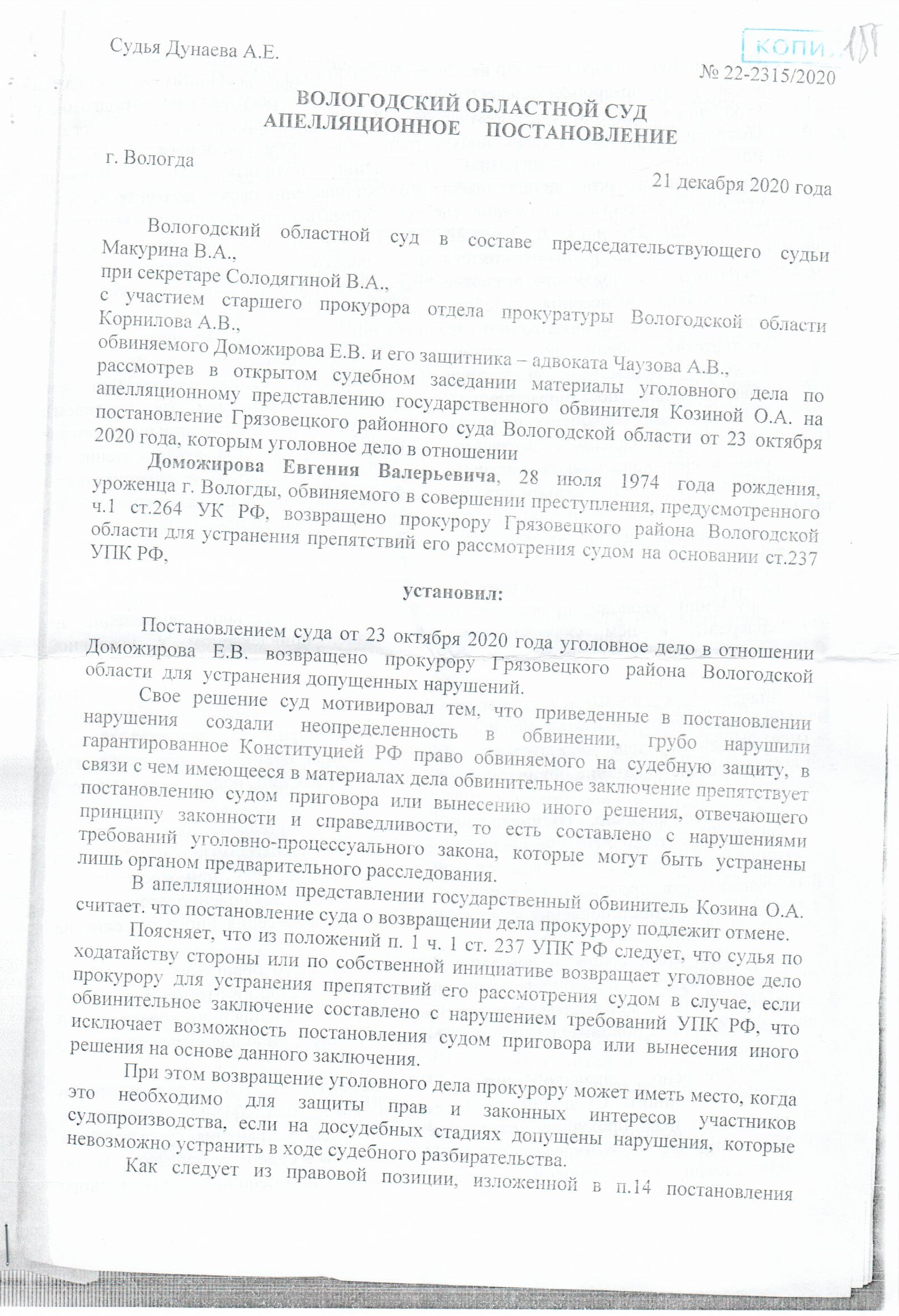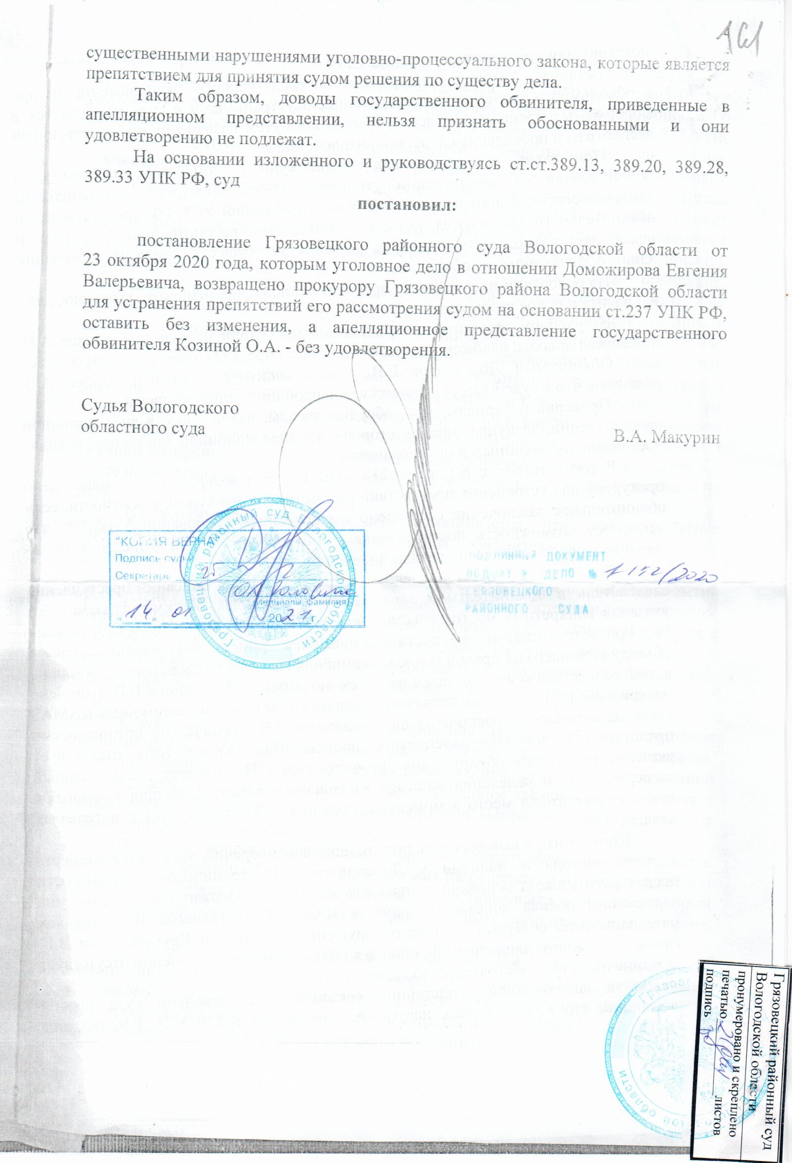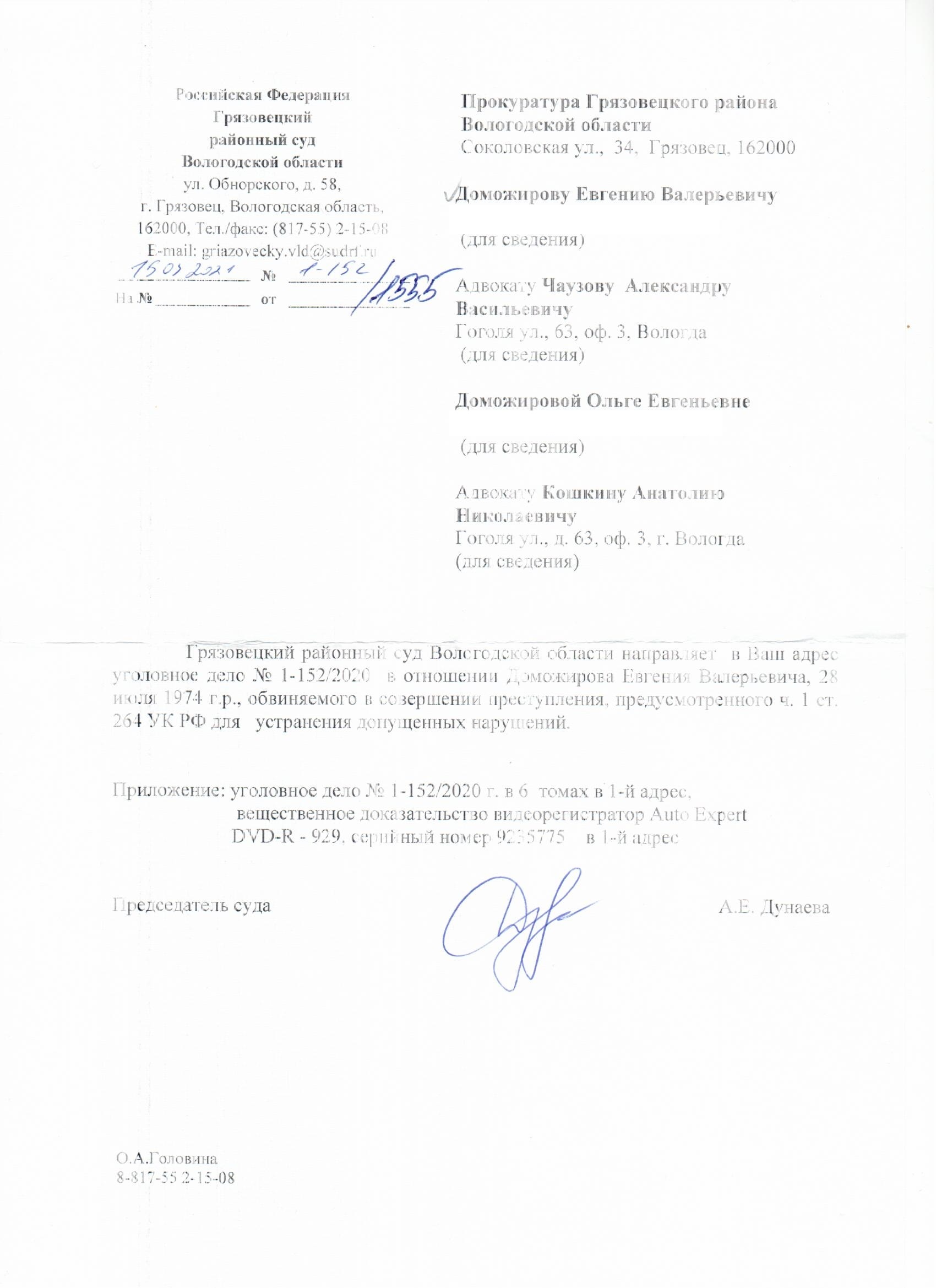 Итак. Получили свежее письмо из грязовецкого суда о направлении в прокуратуру района уголовного дела по части 1 статьи 264 УК РФ в отношении обвиняемого Доможирова.