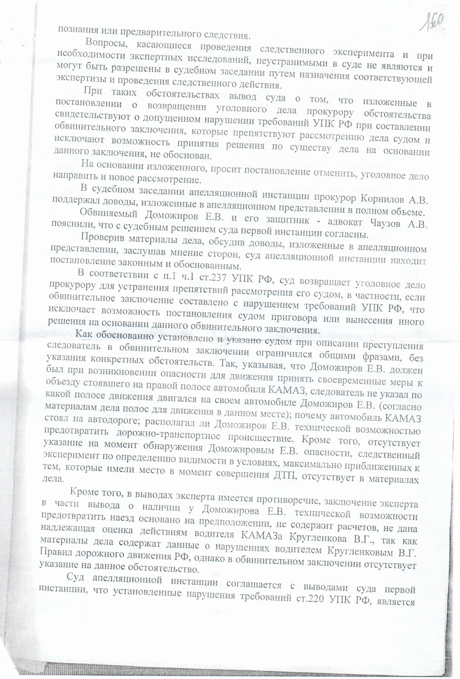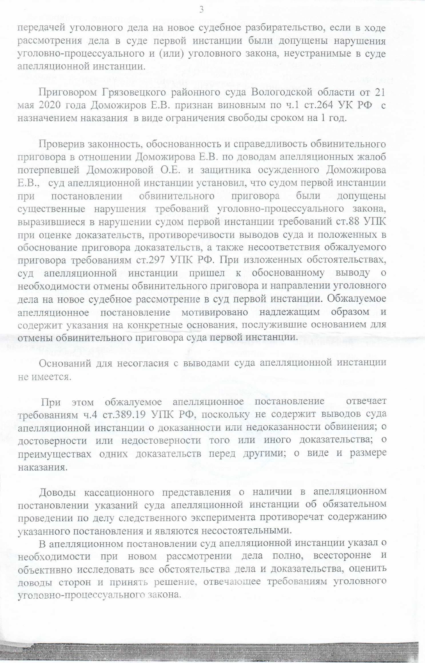 В котором суд в очередной раз указал на важные обстоятельства, связанные с отсутствием оценки нарушения ПДД водителем снегоуборщика. Однако прокуратура области в лице зампрокурора области решила идти в кассационную инстанцию. То есть упорно не желала исправлять дело и с целью, как я считаю, увода настоящего виновника от ответственности, всячески затягивала его. В конечном итоге выйдя за сроки давности привлечения к уголовной ответственности. Хотя этот виновник еще два года назад на следствии и полтора года назад в суде дал все изобличающие его вину показания.