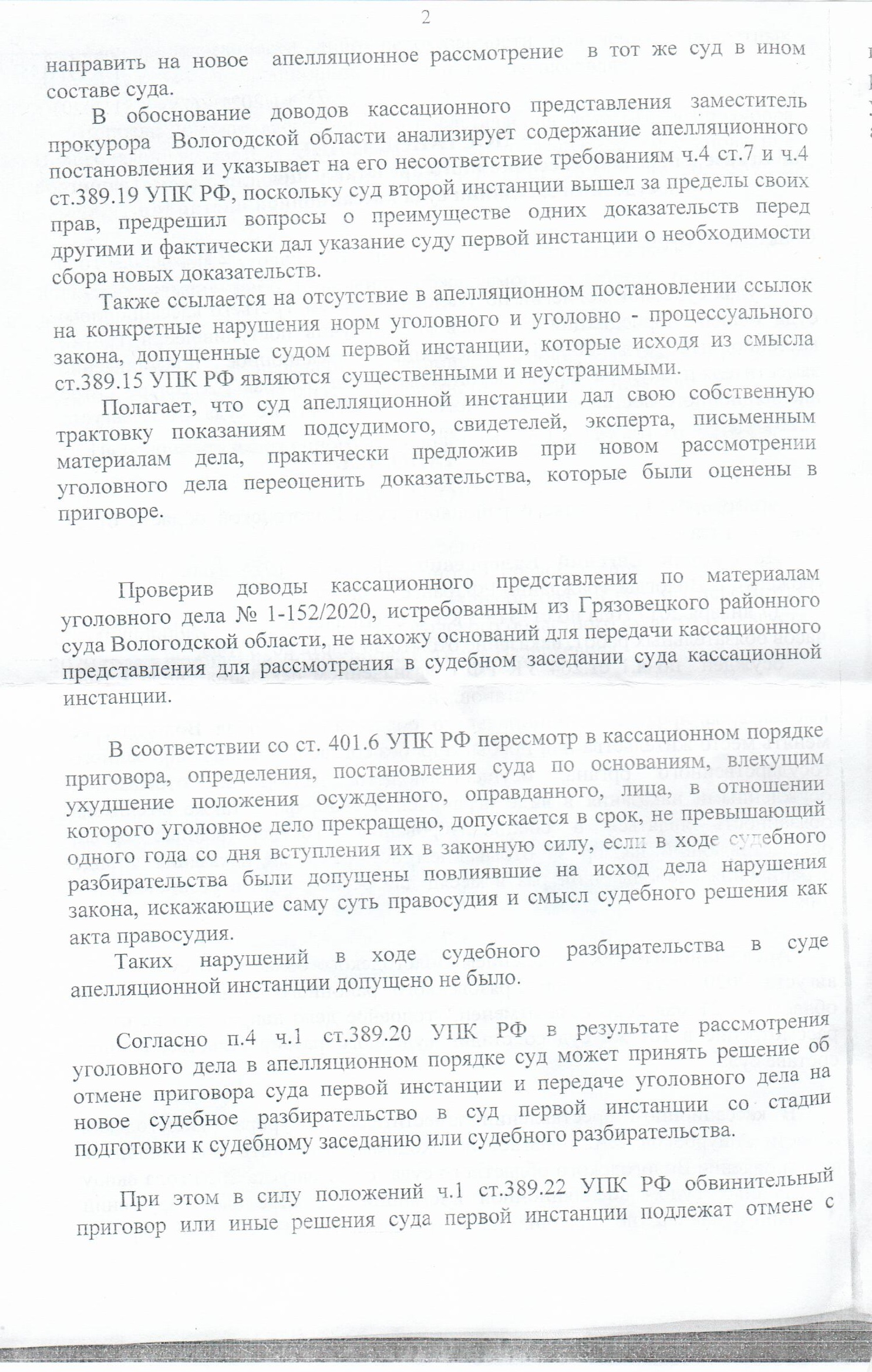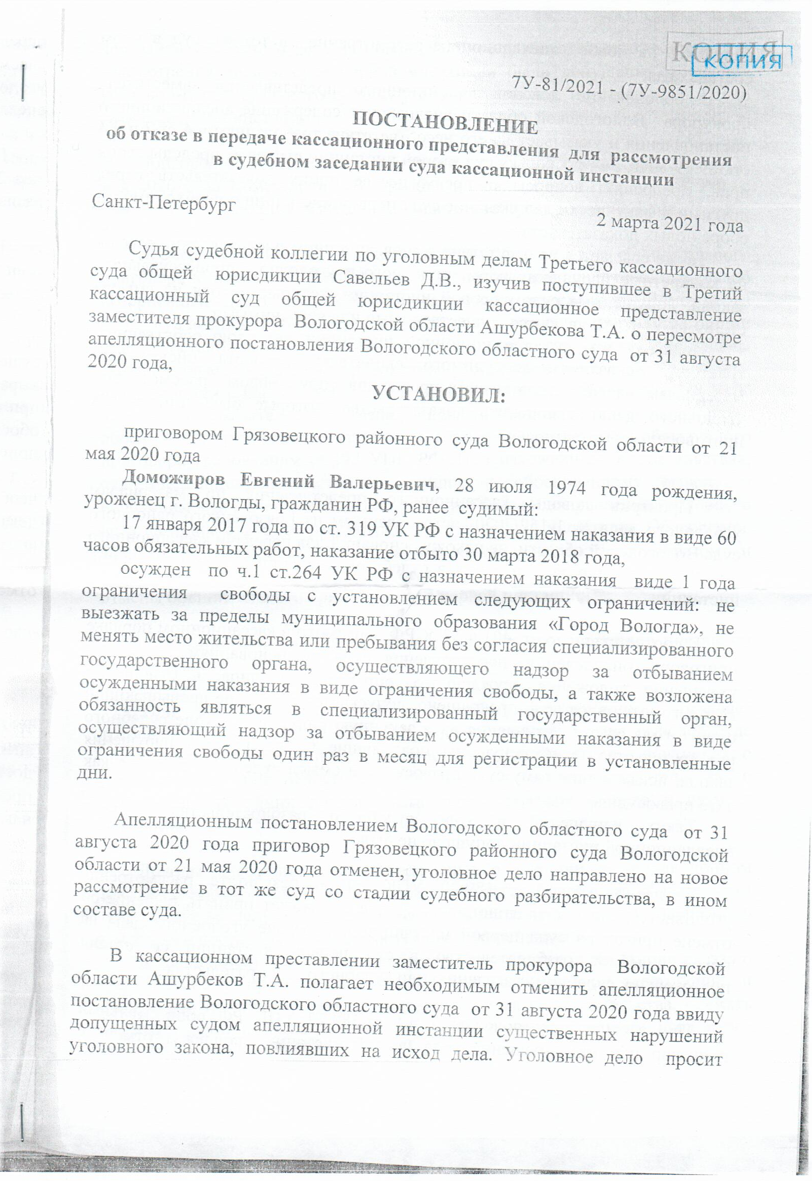 Напомню, что 21 мая 2020 года я был осужден грязовецким судом, 31 августа 2020 года приговор отменен областным судом, а 23 октября 2020 года грязовецким судом дело возвращено в прокуратуру. Прокуратура обжаловала возврат дела, но 28 декабря 2020 года получила очередной отказ от областного суда.