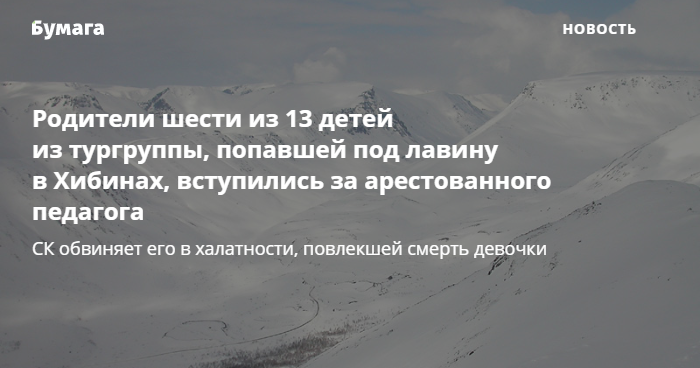 Родители шести из 13 детей, которые входили в туристическую группу, попавшую под лавину в Хибинах, вступились за педагога Сергея Смирнова, арестованного по делу о халатности, повлекшей смерть девочки. Об этом сообщает издание «Север.Реалии» со ссылкой на Вячеслава Мавричева, отца одного из детей. Некоторые родители также опубликовали посты во «ВКонтакте».