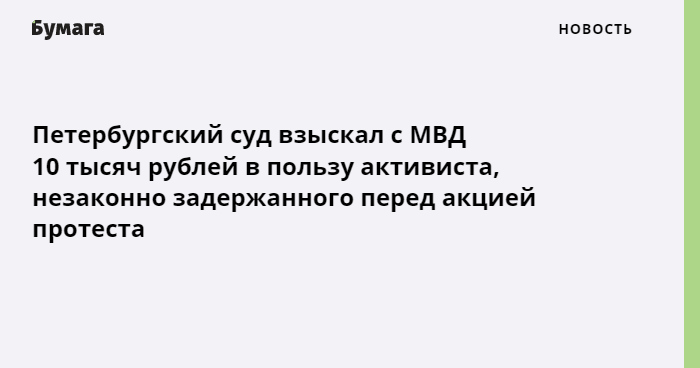 Смольнинский районный суд взыскал с МВД 10 тысяч рублей за незаконное задержание активиста перед акцией протеста в 2018 году. Об этом сообщает «Апология протеста».