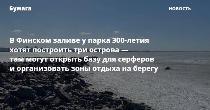 В акватории Финского залива возле парка 300-летия в Петербурге могут появиться три острова для серферов. Об этом говорится в проектной документации «Базы водных видов спорта в Приморском районе», которую готовит АО «Зенит-Арена». Комитет по природопользованию 29 марта выставил на общественное обсуждение часть документов — проект технического задания на проведение оценки воздействия на окружающую среду.