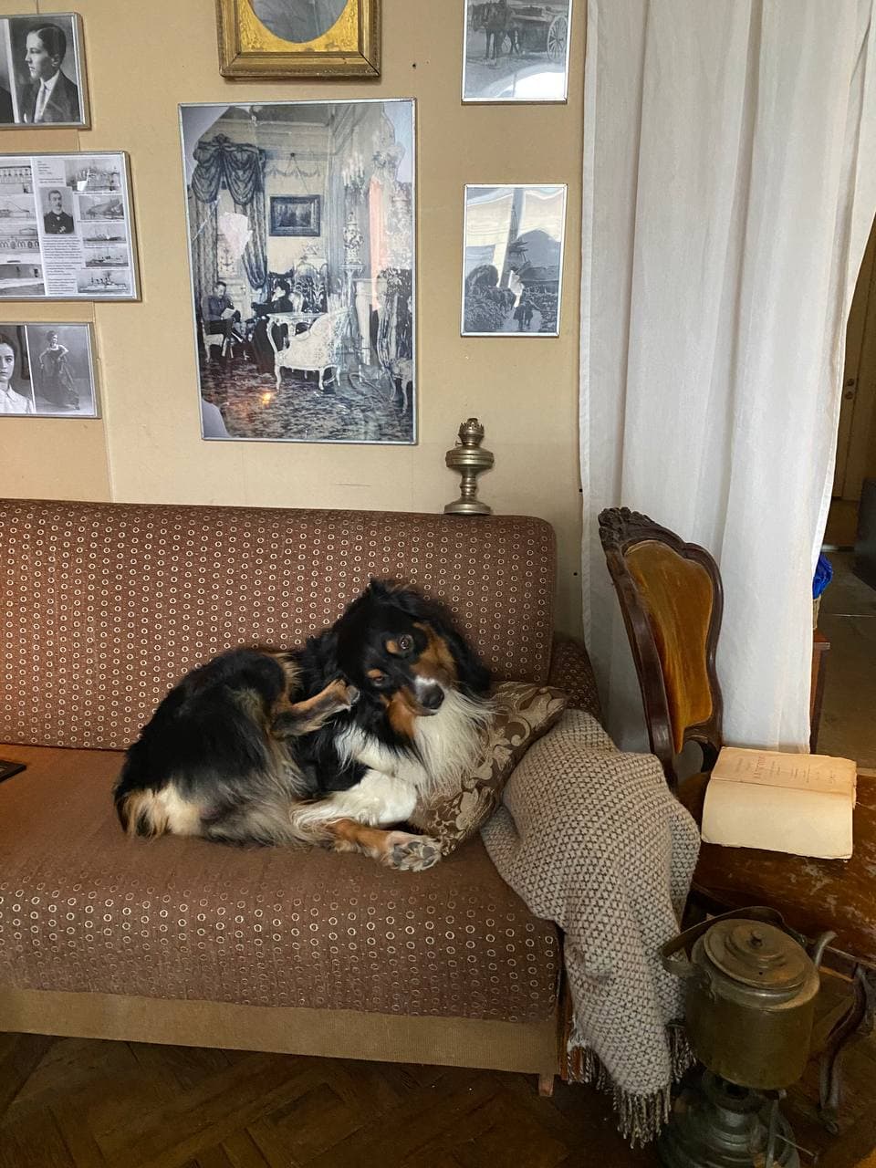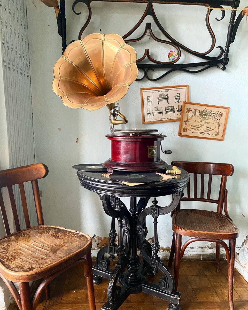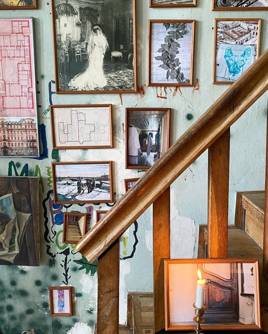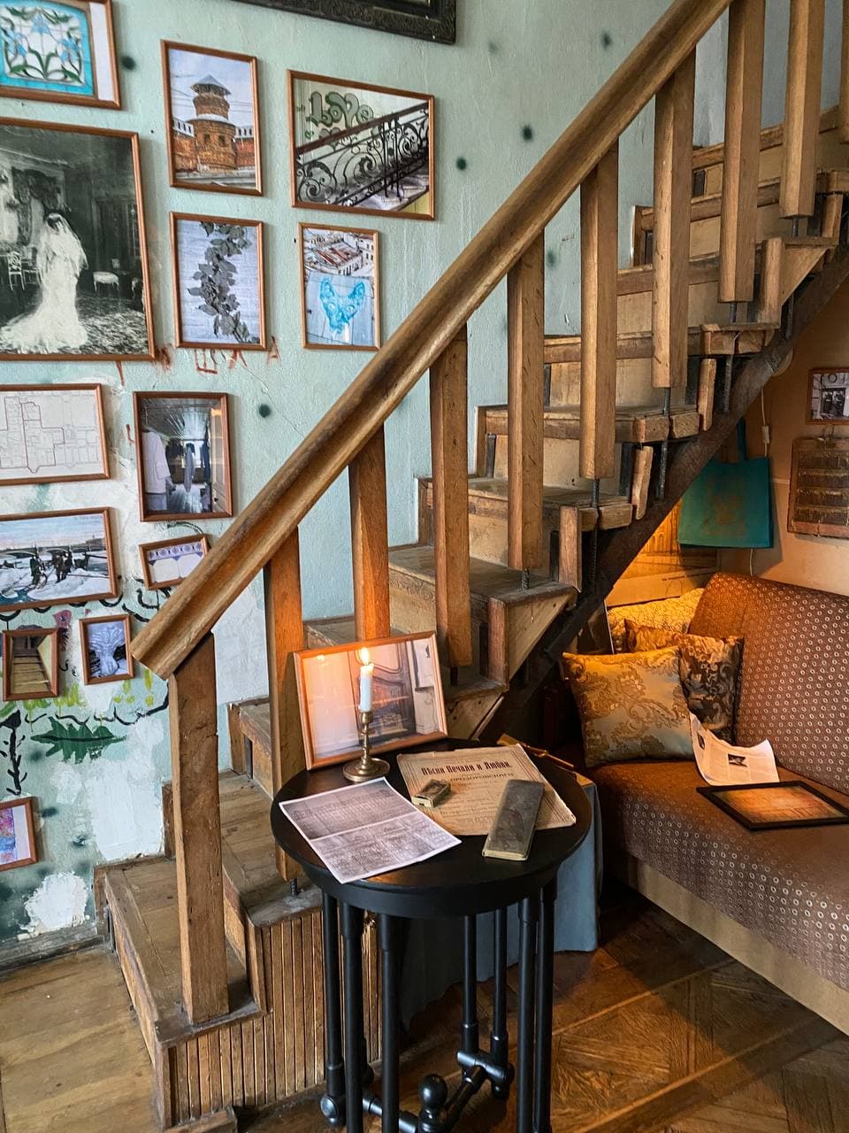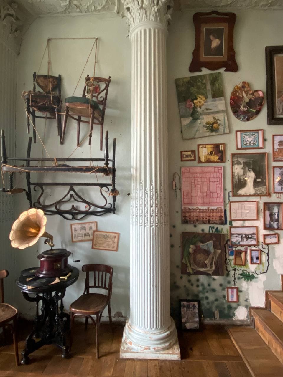 В одной из комнат квартиры создали настоящий музей — со старинной мебелью, архивными снимками, картинами. Также здесь можно полюбоваться сохранившимися элементами интерьера: колоннами, паркетом, камином из итальянского мрамора. Эффектнее всего выглядит стена — с подвешенными стульями и диваном. А еще в комнате оборудован второй этаж: наверх ведет деревянная лестница, с которой очень удобно делать фотографии.