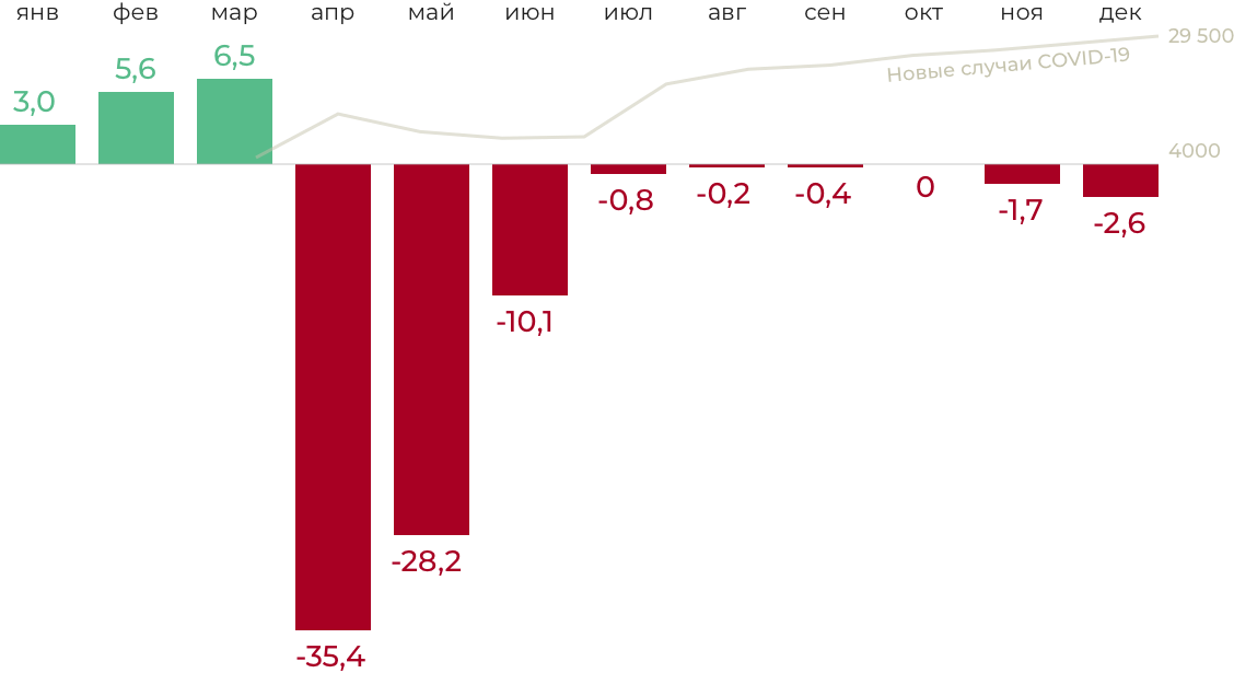 В апреле 2020 года сокращение потребления платных услуг относительно апреля 2019 года составило по регионам от 20% (Алтайский край) до 55% (Северная Осетия), в том числе в Москве и Санкт-Петербурге — 43% и 40%, а в среднем по России — 35%.