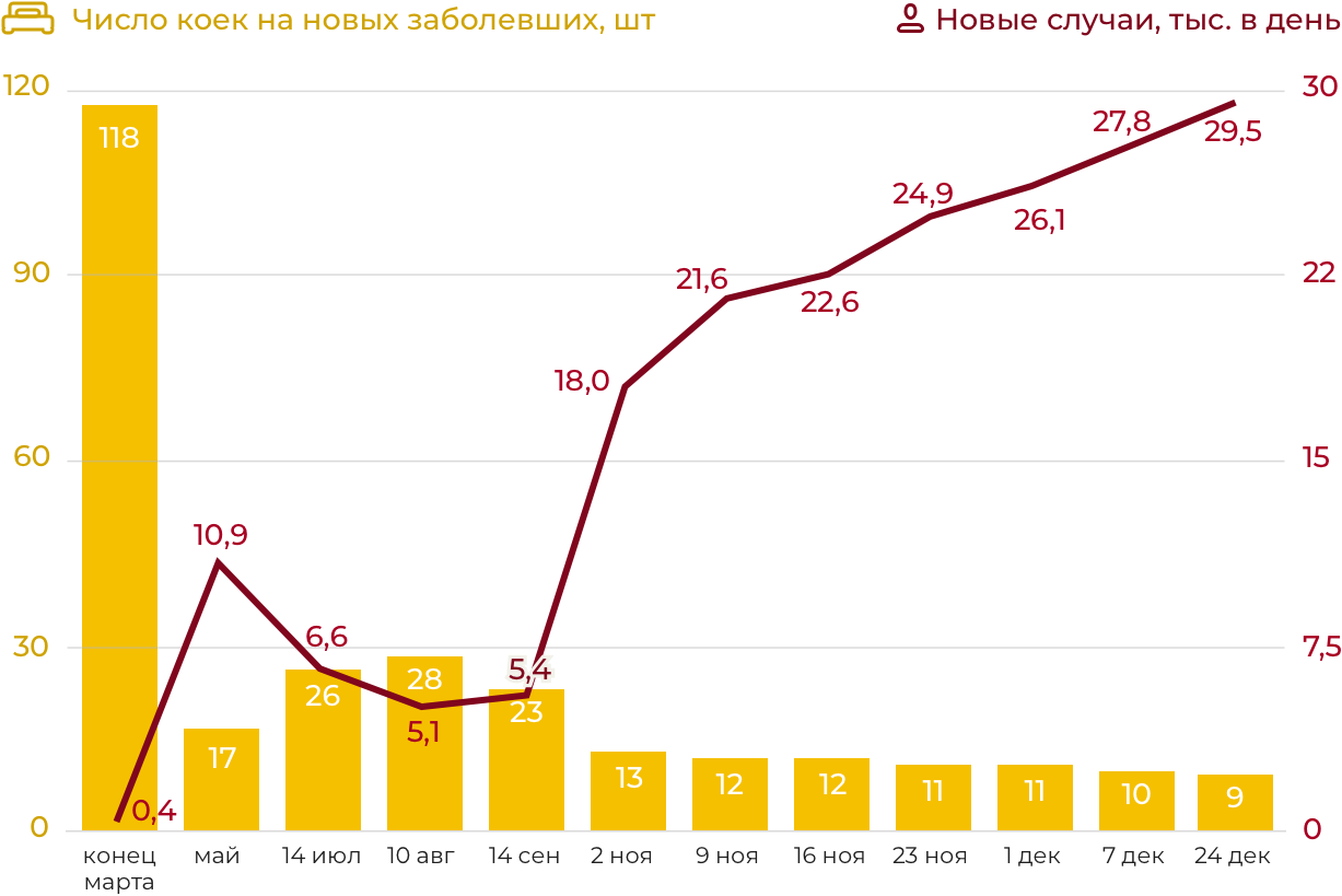 Нарастить их так же быстро, как росло число больных, не удалось. С 14 сентября по 24 декабря, например, число новых больных увеличилось в шесть раз, а число коек — только в 2,2 раза , в эти даты проходили заседания координационного совета по коронавирусу правительства, где сообщалось число коек.