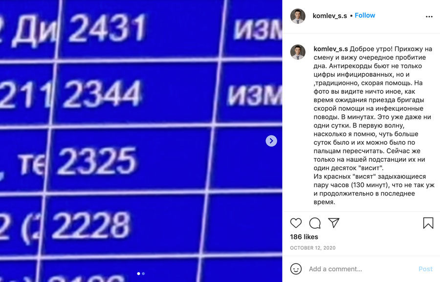 Начиная с середины сентября число новых заболевших в России росло каждый день. К началу октября из регионов стали поступать массовые жалобы на невозможность получить медицинскую помощь — отсутствие скорых, многочасовые очереди в поликлиниках, отказы в госпитализации. В Новосибирске родные 48-летнего мужчины рассказывали, как в течение недели не могли добиться для него ни анализов, ни врача, потом двое суток вызывали скорую. Он умер в больнице через день после госпитализации.
