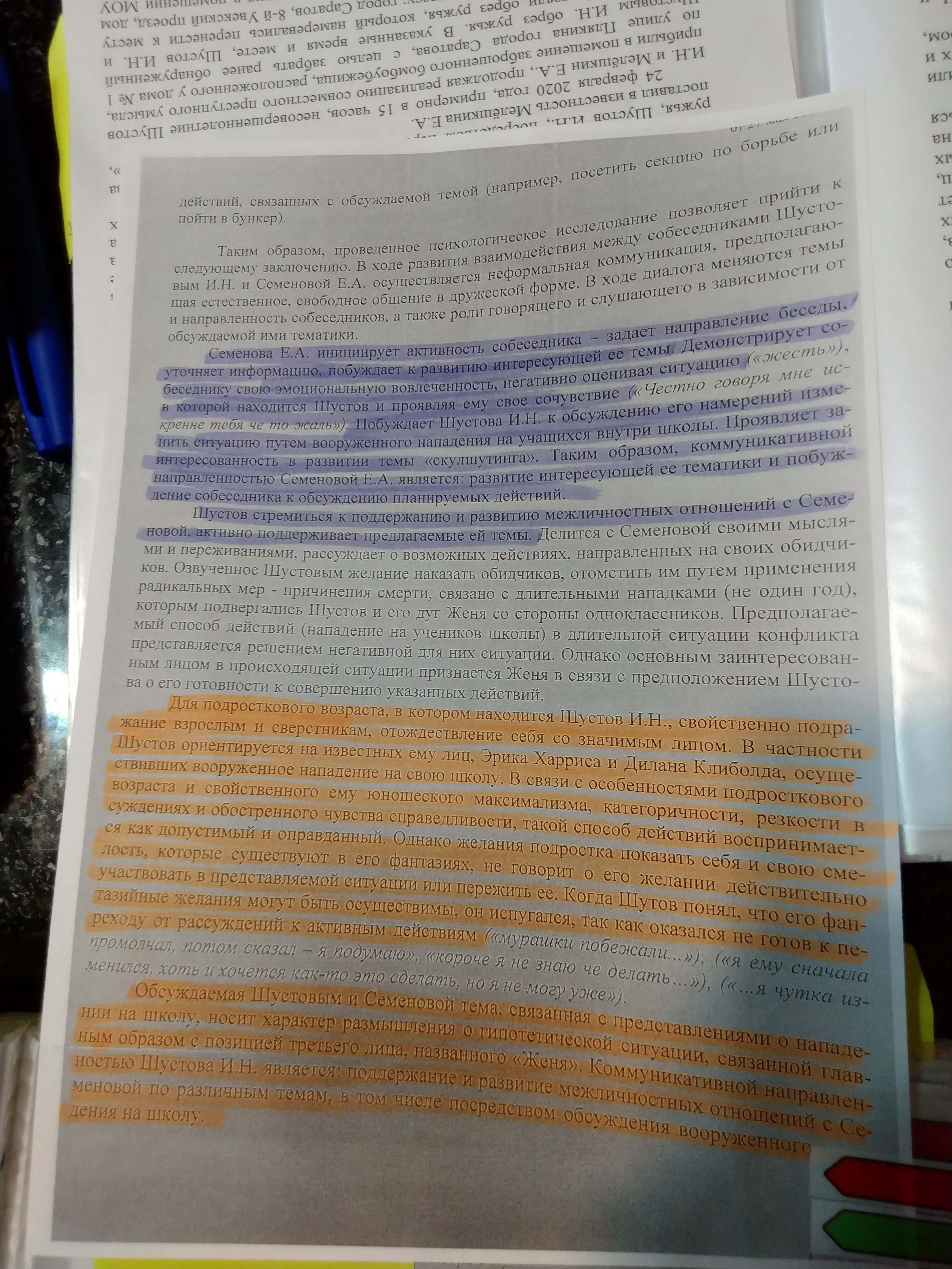 Также в экспертизе сказано, что "для подросткового возраста, в котором находится Шустов, свойственно подражание взрослым и сверстникам, отождествление себя со значимым лицом. В частности, Шустов ориентируется на известных ему лиц Эрика Харриса и Дилана Клиболда, осуществивших вооруженное нападение на свою школу. В связи с особенностями подросткового возраста и свойственного ему юношеского максимализма, категоричности, резкости в суждениях и обостренного чувства справедливости, такой способ действий воспринимается как допустимый и оправданный. Однако желание подростка показать себя и свою смелость, которые существуют в его фантазиях, не говорит о его желании действительно участвовать в представляемой ситуации или пережить её. Когда Шустов понял, что его фантазийные желания могут быть осуществимы, он испугался, так как оказался не готов к переходу от рассуждений к активным действиям. Обсуждаемая Шустовым и Семёновой тема, связанная с представлениями о нападении на школу, носит характер размышления о гипотетической ситуации, связанной главным образом с позицией третьего лица" (копия экспертизы есть в распоряжении редакции. –Прим. РС).