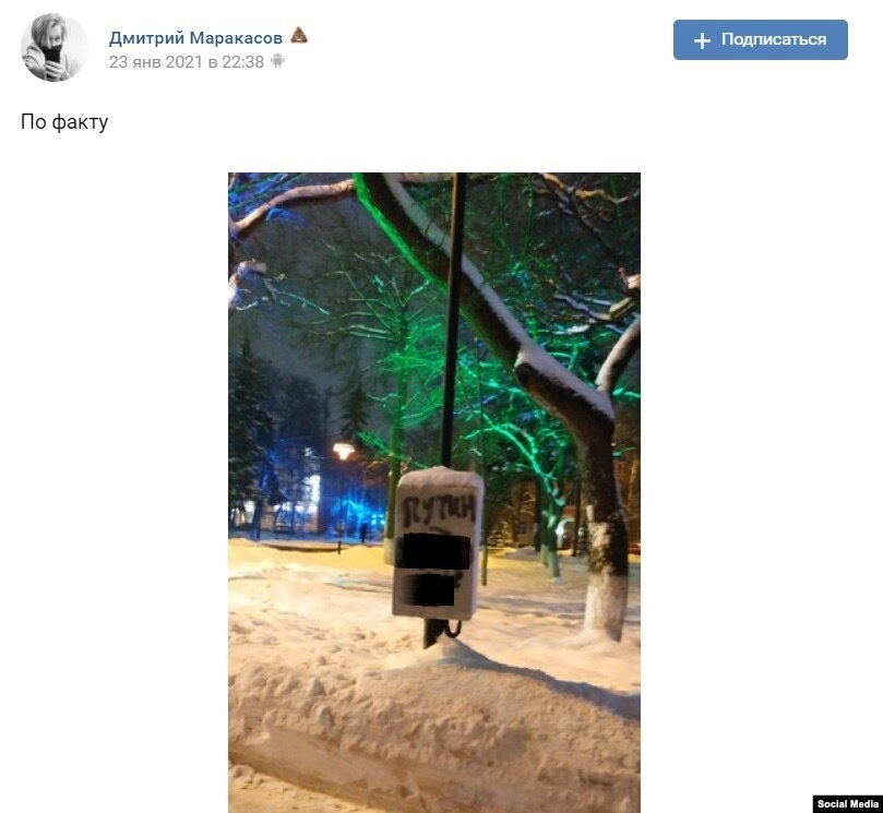 В Вологде суд оштрафовал 19-летнего Дмитрия Маракасова на 30 тысяч рублей по административной статье об оскорблении власти. Он сфотографировал ящик столба, на котором была надпись "Путин *****". Об этом Север.Реалии рассказал сам Маракасов.