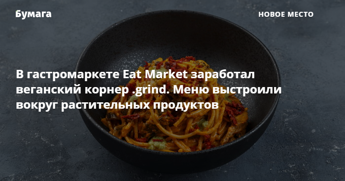 В гастромаркете Eat Market на пятом этаже ТРЦ «Галерея» открыли веганский корнер .grind, сообщили «Бумаге» создатели проекта. Меню разработала Юлия Лухверчик (MET, Espresso Tonic), она выстроила его вокруг растительных продуктов.