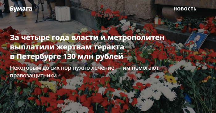 С 2017 по 2021 годы родственники погибших и пострадавшие во время теракта 3 апреля получили в общей сложности более 130 миллионов рублей компенсаций — из федерального и петербургского бюджетов, а также из средств ГУП «Петербургский метрополитен». Об этом «Бумаге» сообщили в пресс-службе комитета по социальной политике Петербурга.