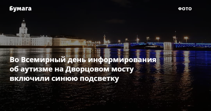 Во Всемирный день информирования об аутизме на Дворцовом мосту включили синюю подсветку в поддержку людей с расстройствами аутистического спектра (РАС). «Бумага» показывает фото.