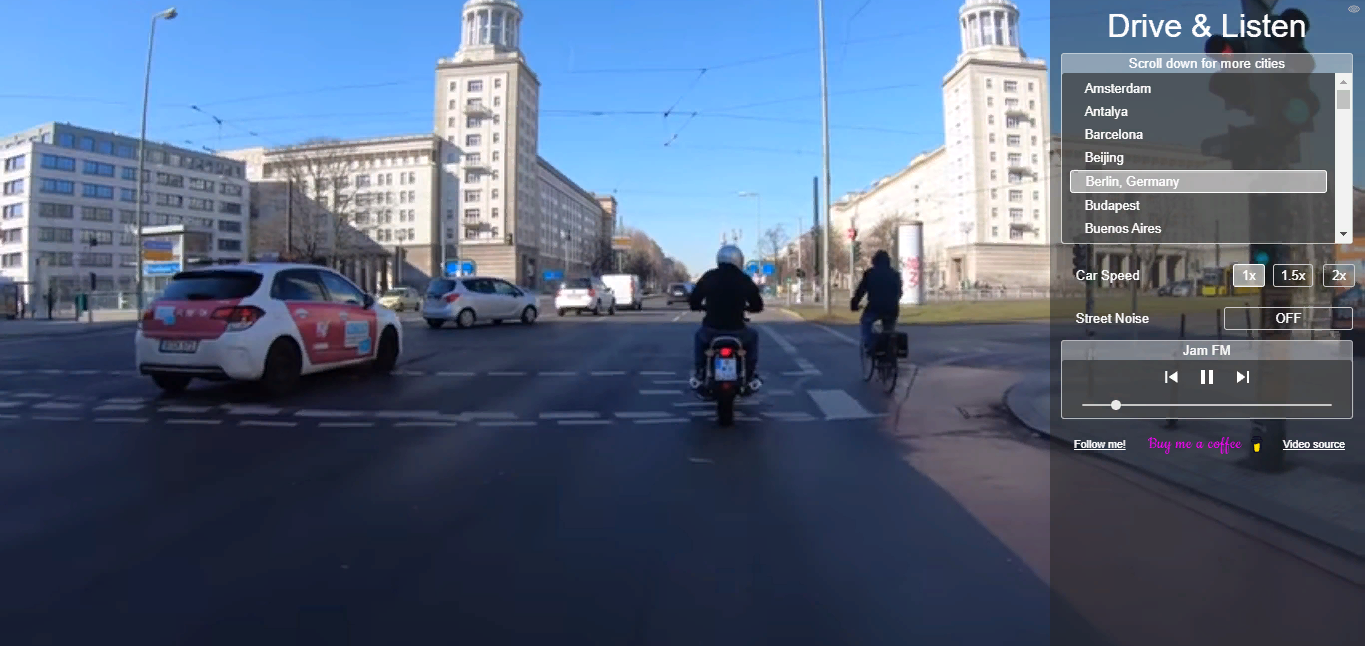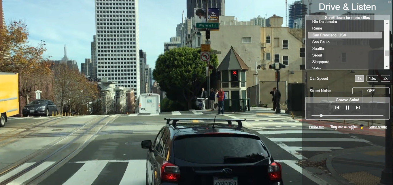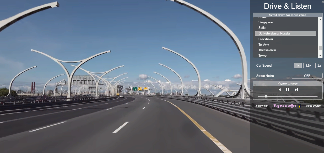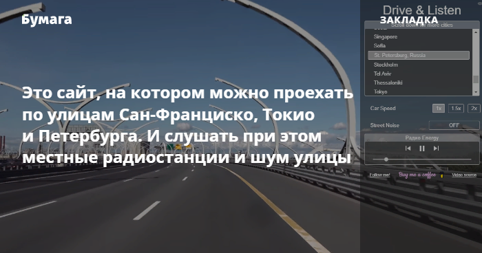 Сайт Drive & Listen — идеальное развлечение (и способ помедитировать) для тех, кто соскучился по поездкам в другие страны. Здесь можно оказаться на месте водителя, бороздящего дороги разных городов мира. Поездка сопровождается музыкой с местных радиостанций.