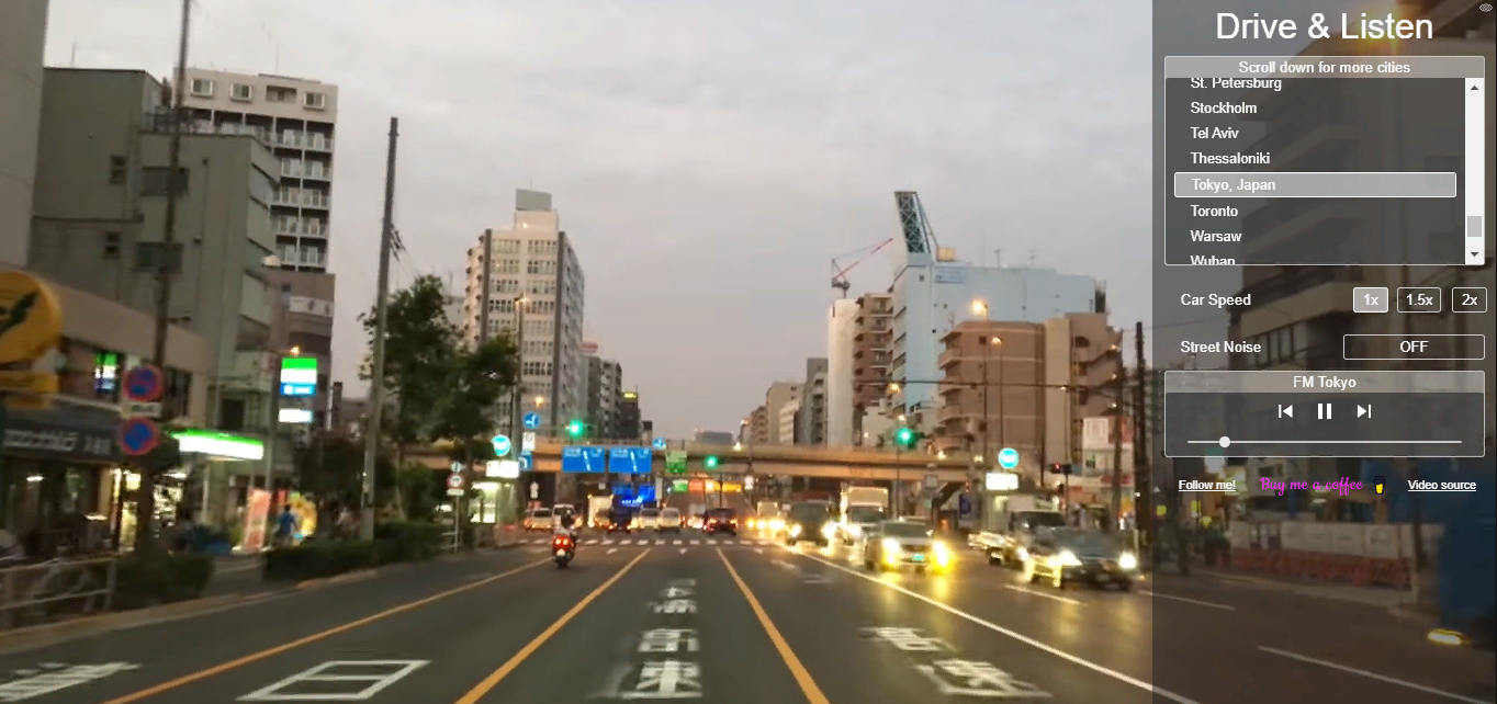 В списке более 50 городов, среди которых Петербург и Москва, Берлин и Лондон, Сан-Франциско и Токио и даже китайский Ухань. Можно включить шум улицы и ускорить поездку. Сервис бесплатный, но есть возможность задонатить автору любую сумму.