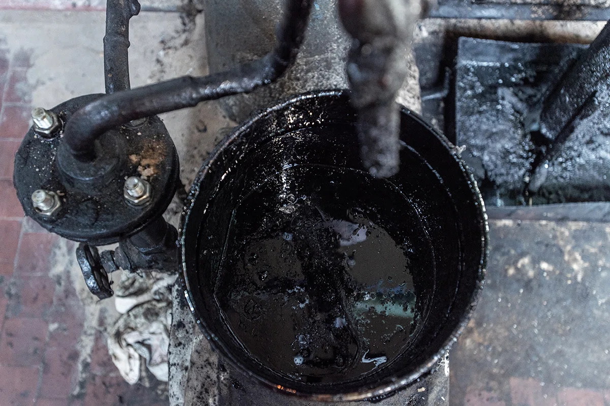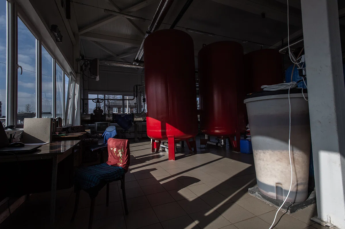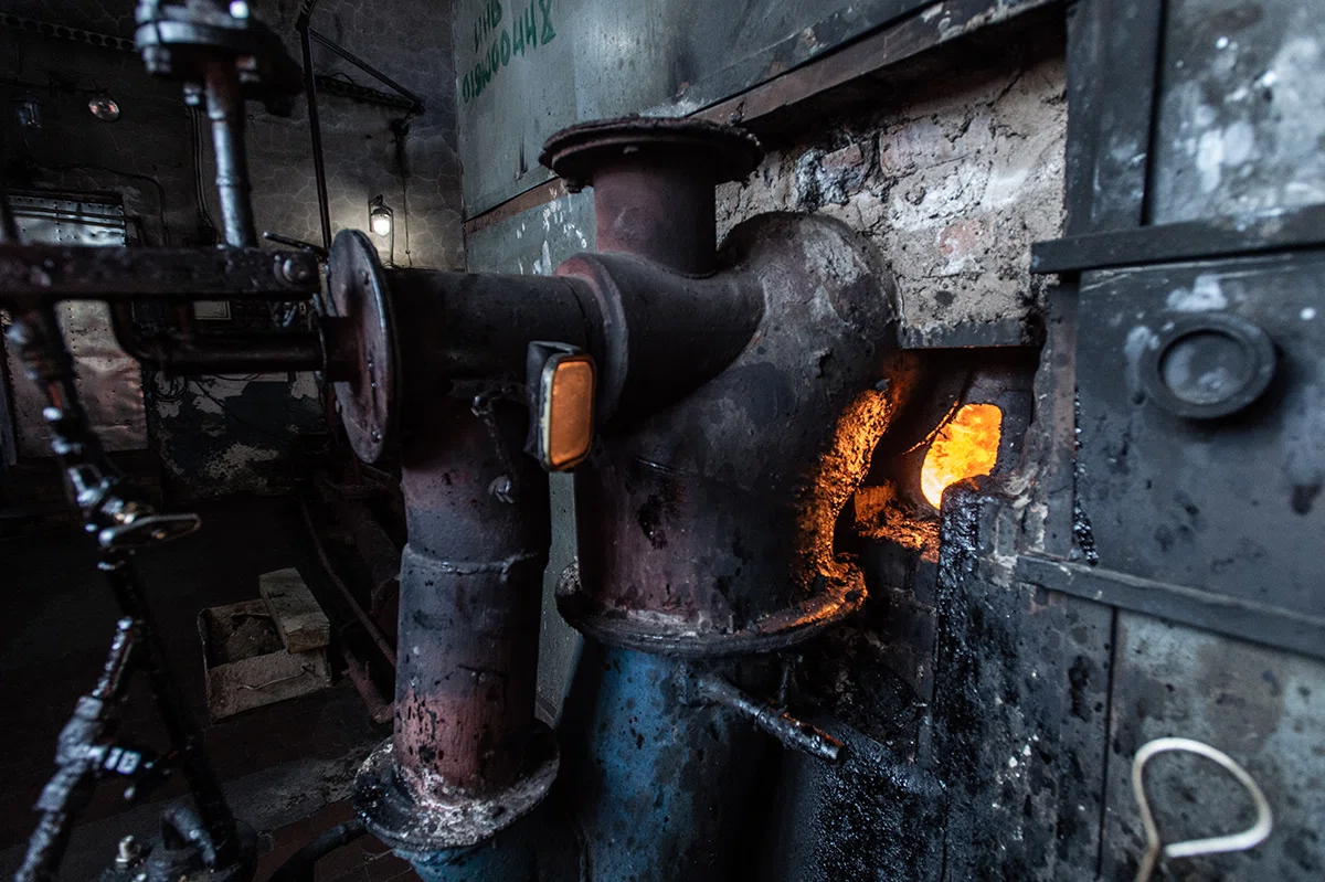 Мазутная котельная № 6 в Нелидово расположена дверь в дверь со зданием местной прокуратуры. На входе цистерны, тоже из прошлого века, советские — это резервуары с мазутом. Со всех сторон что-то булькает, чадит, подтекает, грохает. Утечку собирают в ведерко с одной стороны, а с другой в чайник. В самой котельной одна дровяная печь для розжига котлов и отдельно мазутная. Все в еще более ветхом состоянии, чем я видела этой зимой в бастовавшем без зарплат истопников Горно-Алтайске.