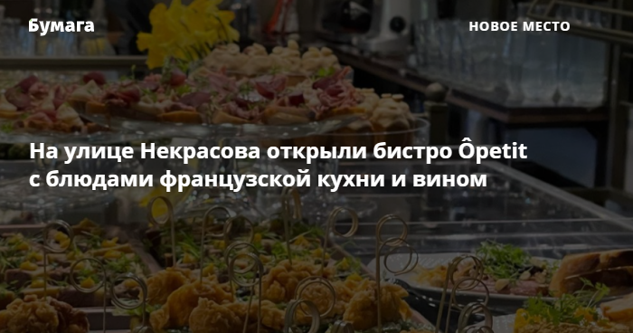 На улице Некрасова, 14А открыли бистро от сети пекарен-кондитерских Ôpetit, рассказали «Бумаге» основатели проекта. Это заведение на каждый день — с виной картой и полноценным меню французской кухни.