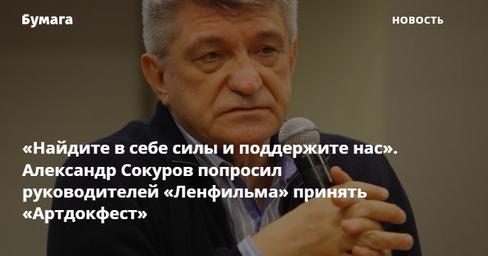 Режиссер Александр Сокуров направил гендиректору «Ленфильма» Федору Щербакову и председателю совета директоров киностудии Федору Бондарчуку письмо с просьбой принять на их площадке «Артдокфест». Об этом он сообщил в фейсбуке.