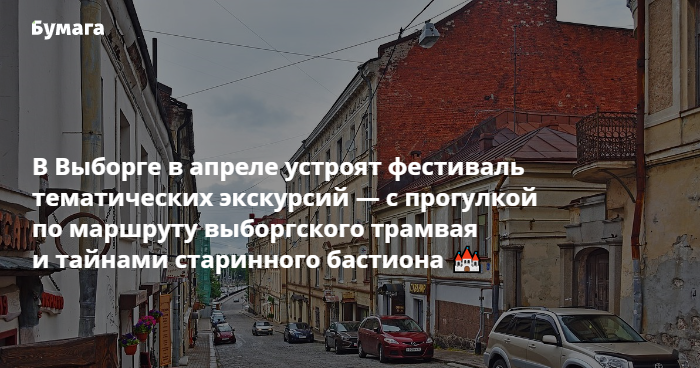 В Выборге с 17 по 25 апреля пройдет фестиваль экскурсий. Его организует Гильдия экскурсоводов Выборга, сообщила «Бумаге» Оксана Юркова, пресс-атташе фестиваля.