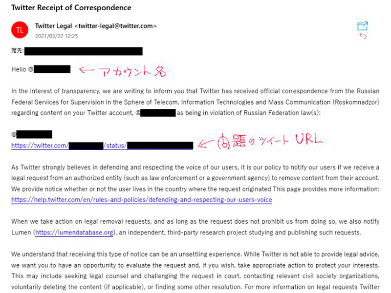 最近、絵描き界隈で【ロシア連邦電気通信・情報技術・マスコミュニケーション分野監督局(Roskomnadzor)】よりTwitter社を通じて警告メールが届いています。