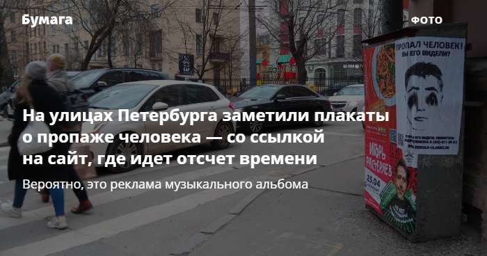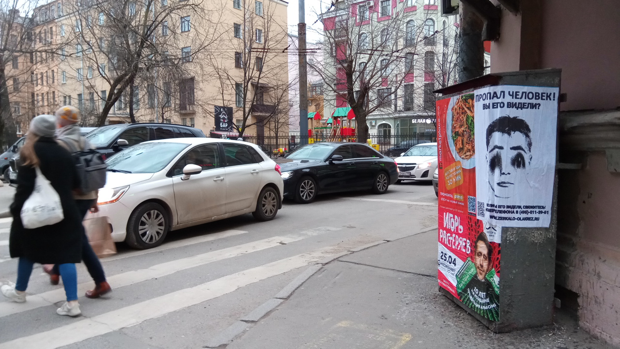 В начале апреля на улицах Петербурга и Москвы заметили плакаты о пропаже человека — на черно-белом портрете смазаны глаза. Фотографии «Бумаге» прислали читатели.