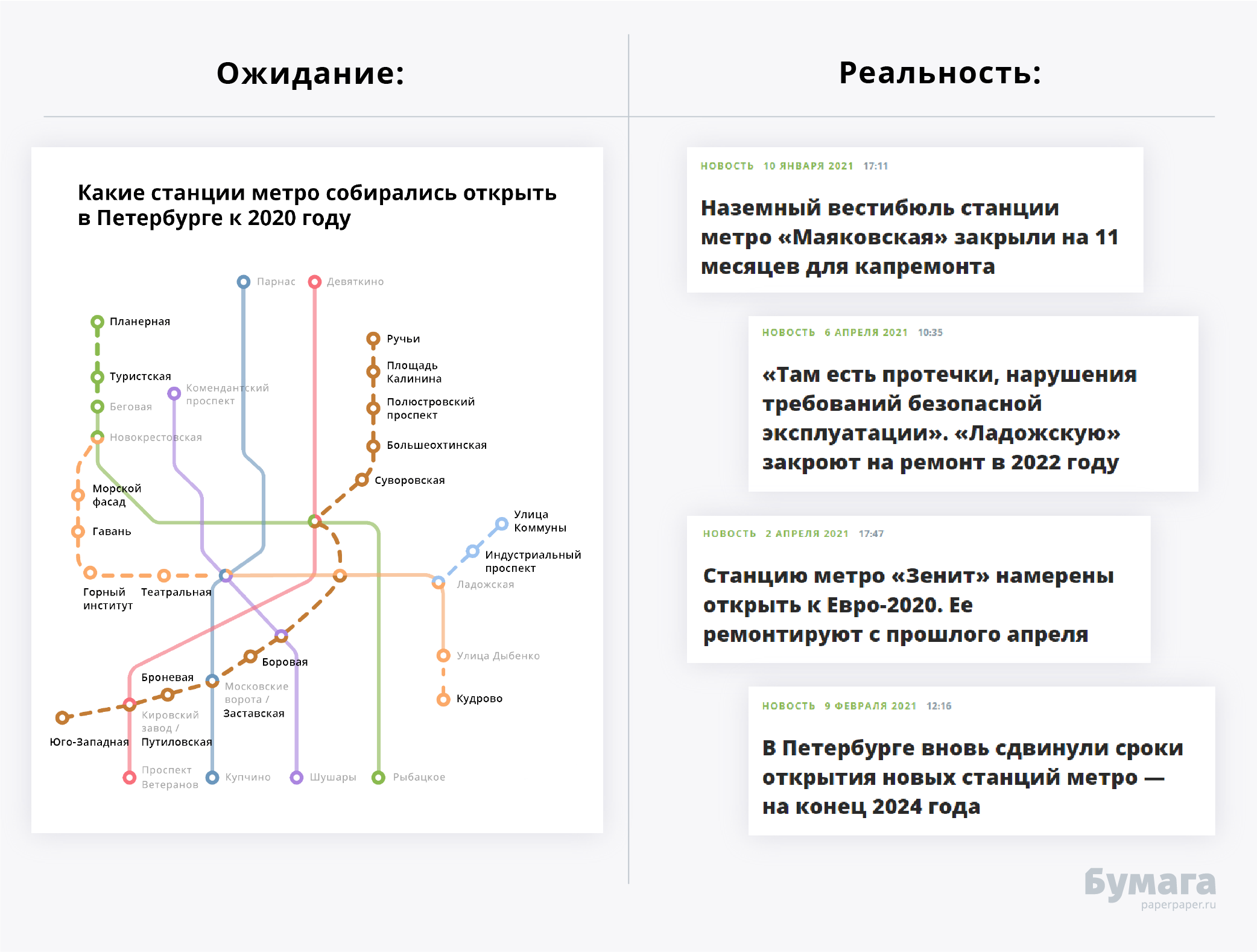 В петербургском метрополитене к 2021 году должны были работать более 90 станций. Но их всего 72. А по факту работает даже меньше — на ремонт сейчас закрыты «Маяковская», «Технологический институт — 1» и «Зенит» (переименованная «Новокрестовская»).