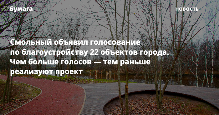 Петербуржцам предложат 22 городские территории — чем больше голосов наберет тот или иной объект, тем раньше реализуют проект по его благоустройству. На голосование вынесены объекты во всех районах города. Благоустроить все 22 территории планируется до 2030 года.