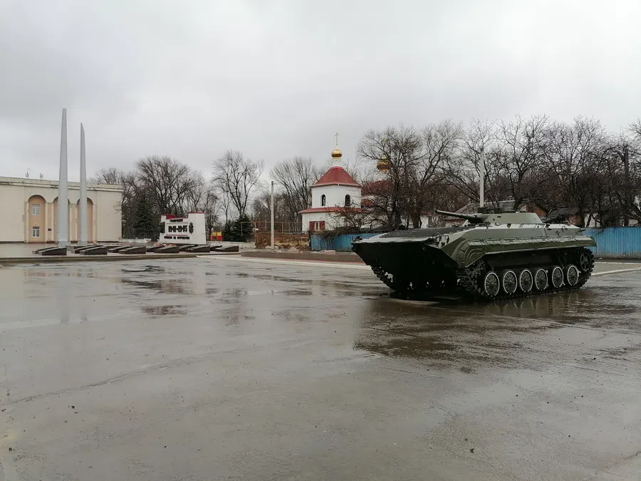 В Гукове единственная военная машина стоит возле мемориала героям Великой Отечественной. БМП буквально светится на фоне унылой архитектуры умирающего шахтерского городка. Редкие прохожие сторонятся дорог с циклопическими лужами, вдали равнодушно машут лопастями ветряки первой в Ростовской области ветряной электростанции.