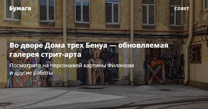 Во дворе Дома трех Бенуа на Каменноостровском проспекте — постоянно обновляемая галерея граффити и стрит-арта