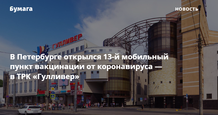 В Петербурге теперь 13 мобильных пунктов, где можно сделать прививку от коронавируса. Новый заработал в ТРК «Гулливер» на Торфяной дороге, сообщили «Бумаге» в комитете по здравоохранению.