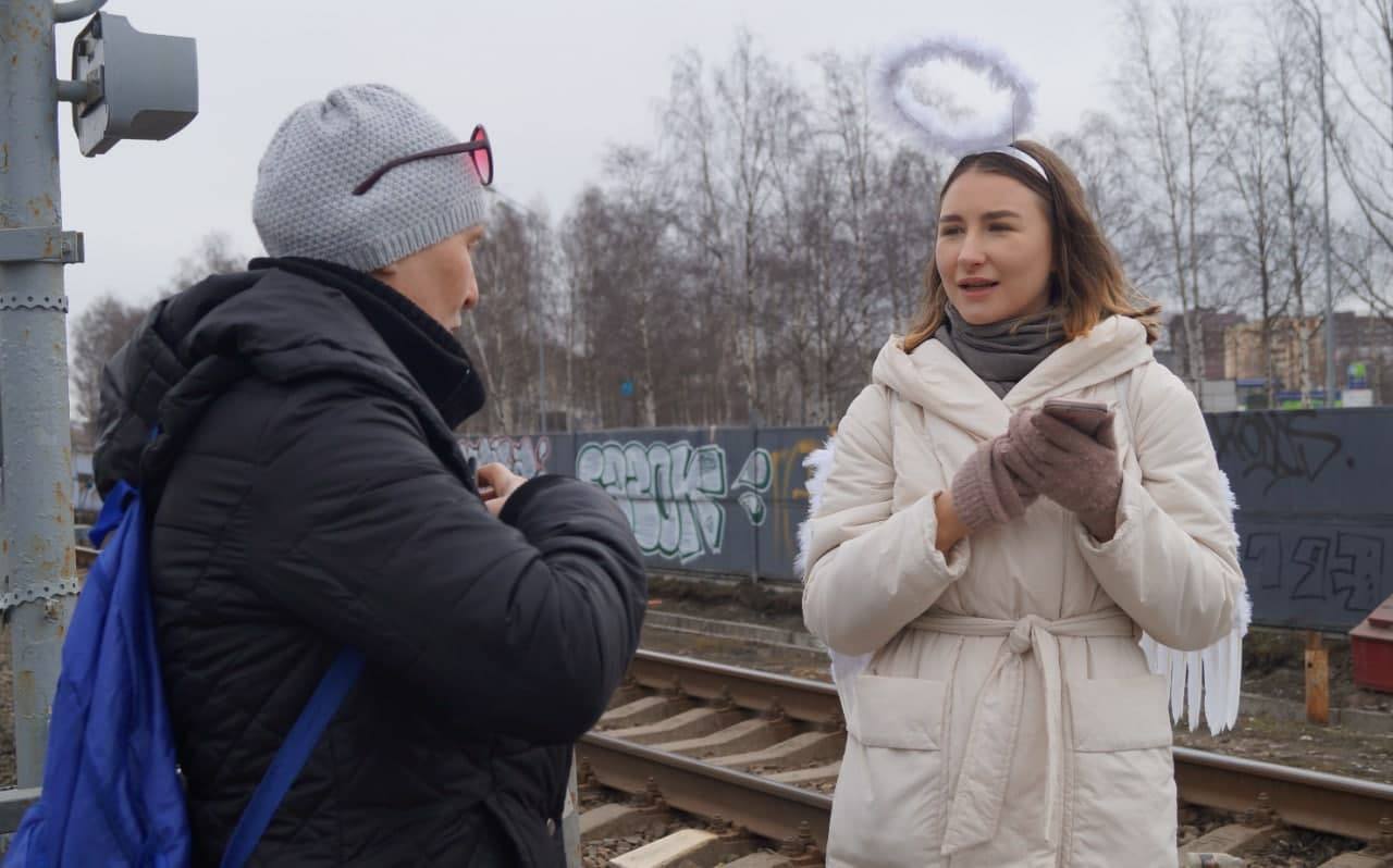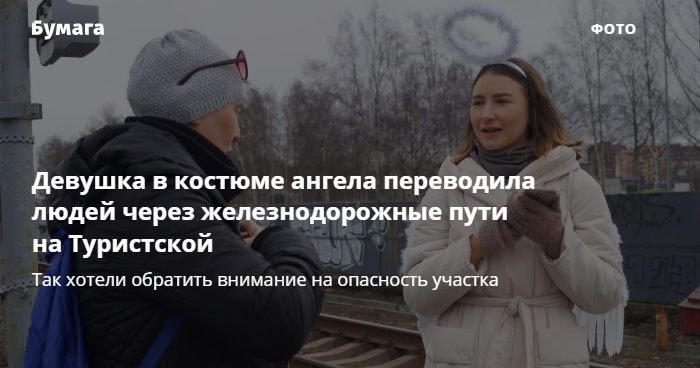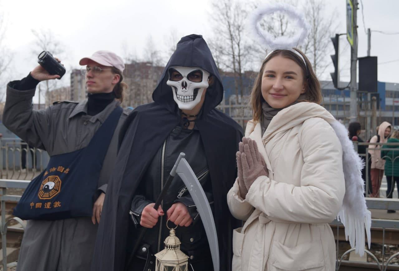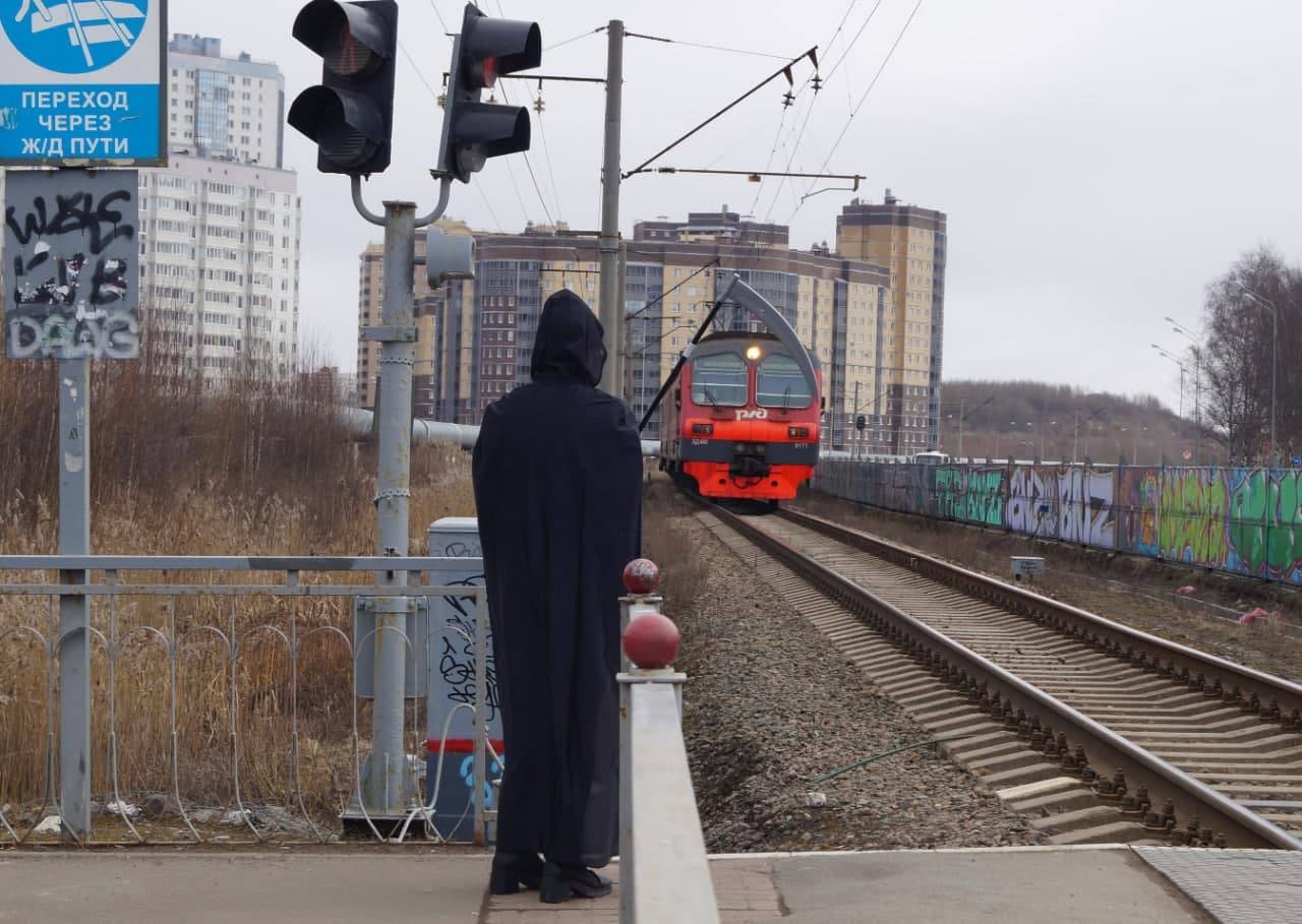 Активисты движения «Петербург — город перемен» устроили перформанс у железнодорожного перехода на Туристской улице. Они надели костюмы Ангела и Смерти, чтобы обратить внимание на опасность участка — несколько человек погибли здесь под колесами поездов.