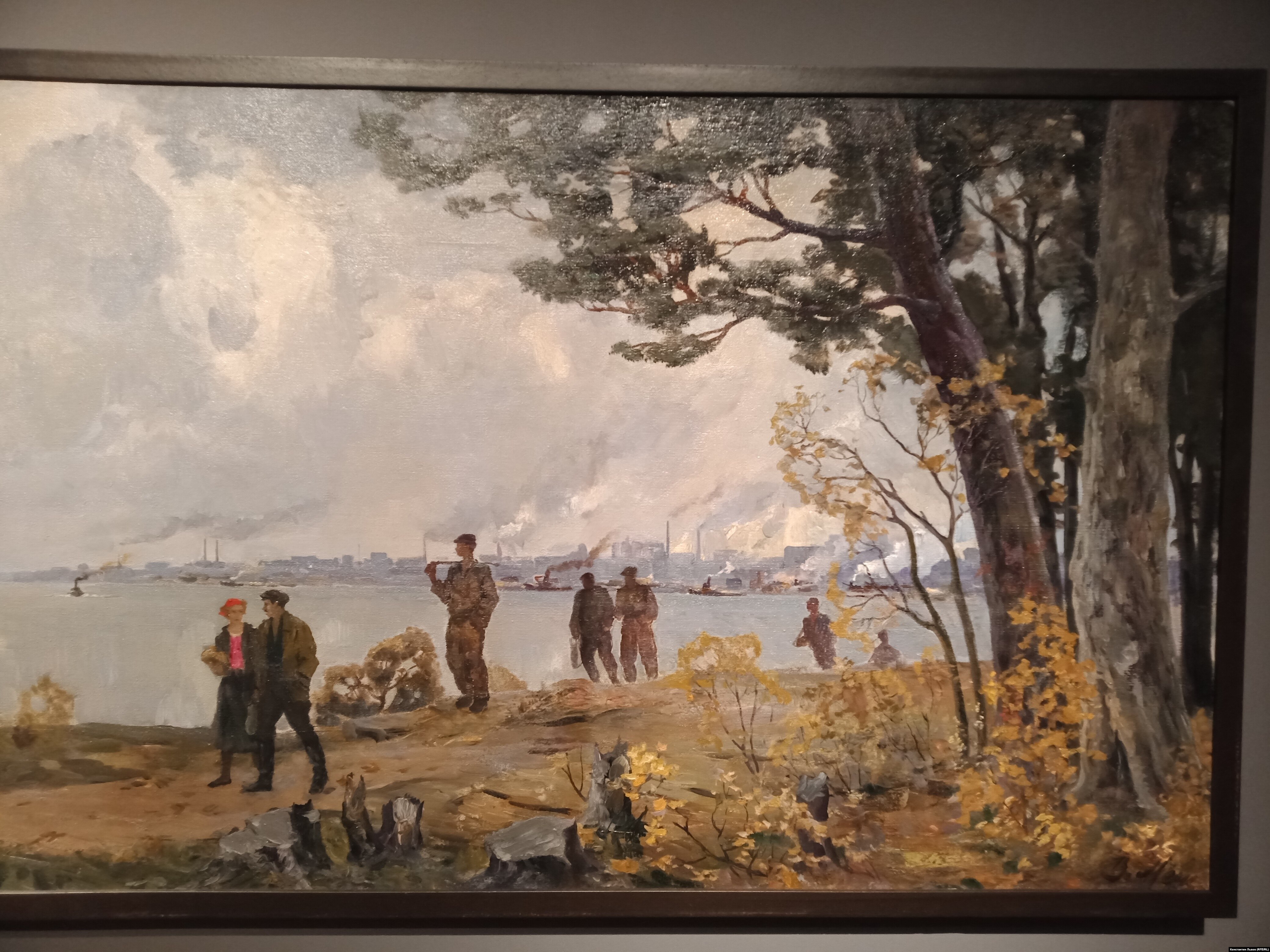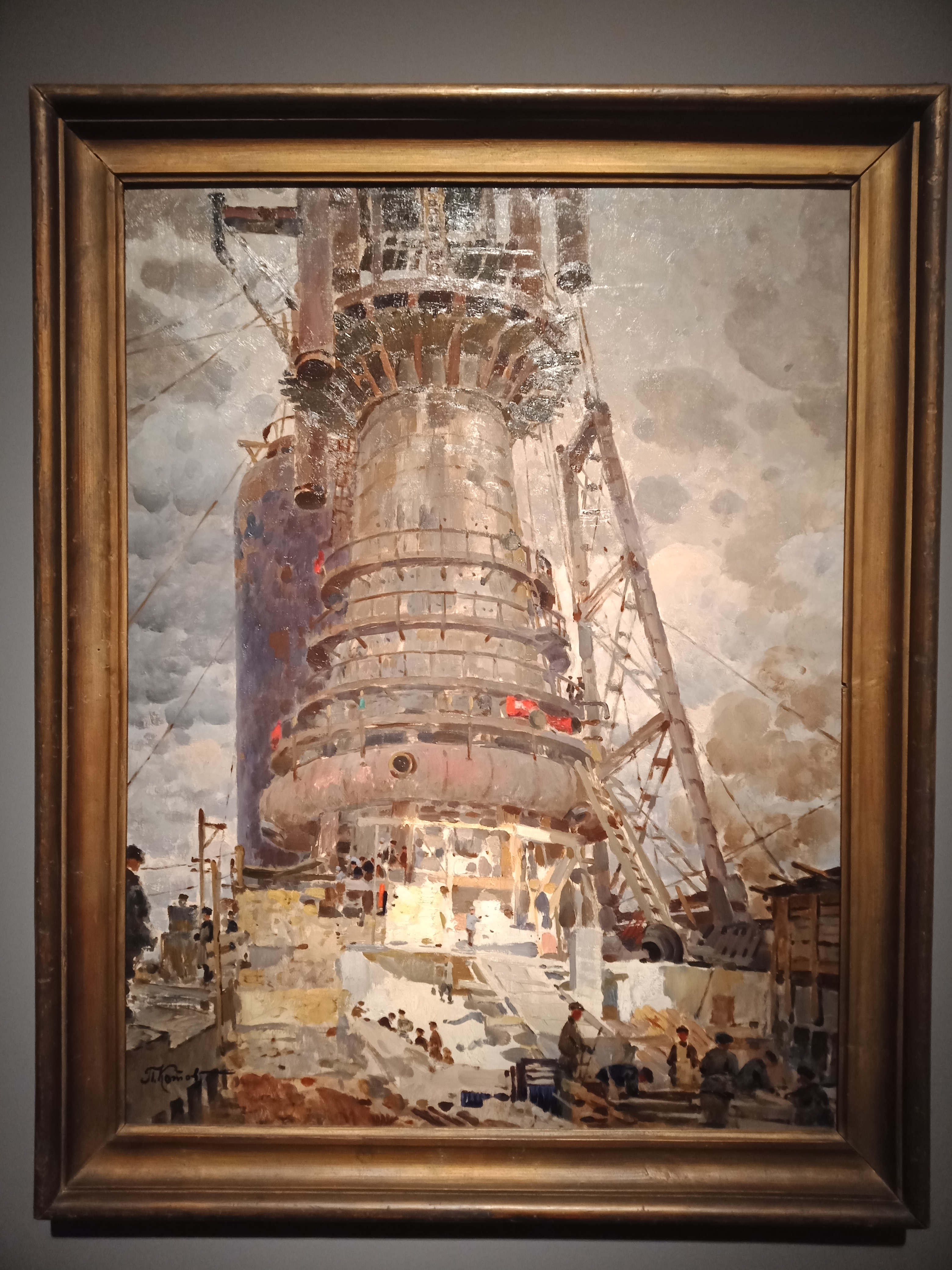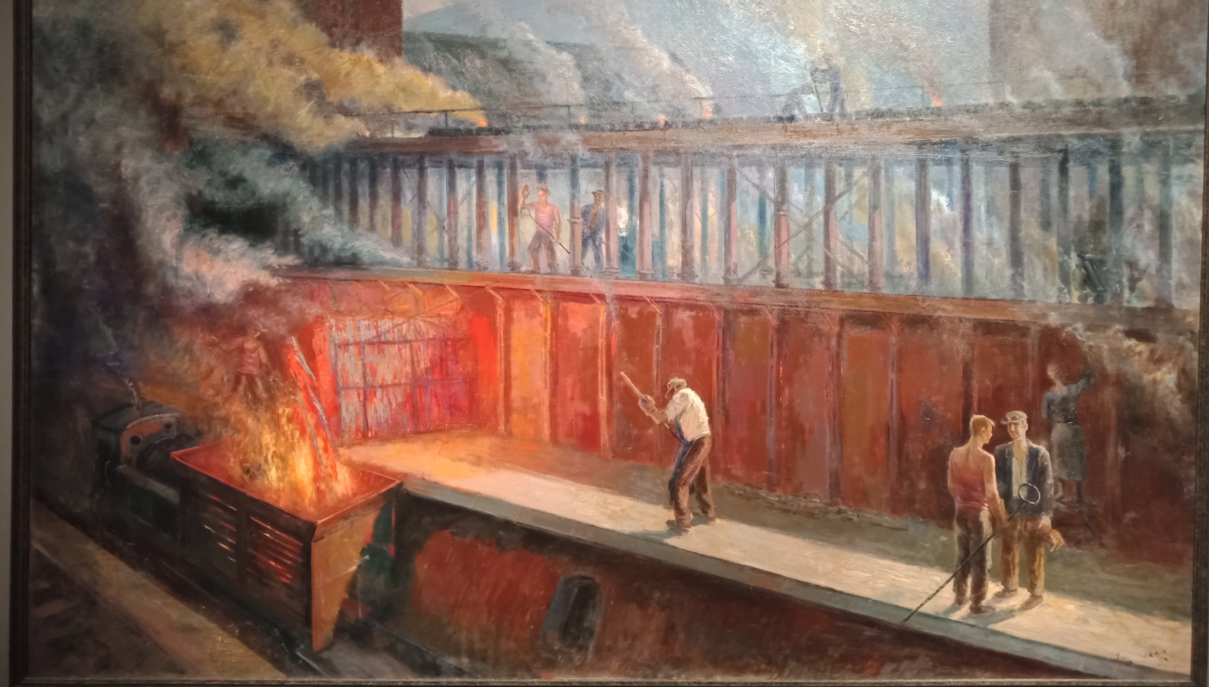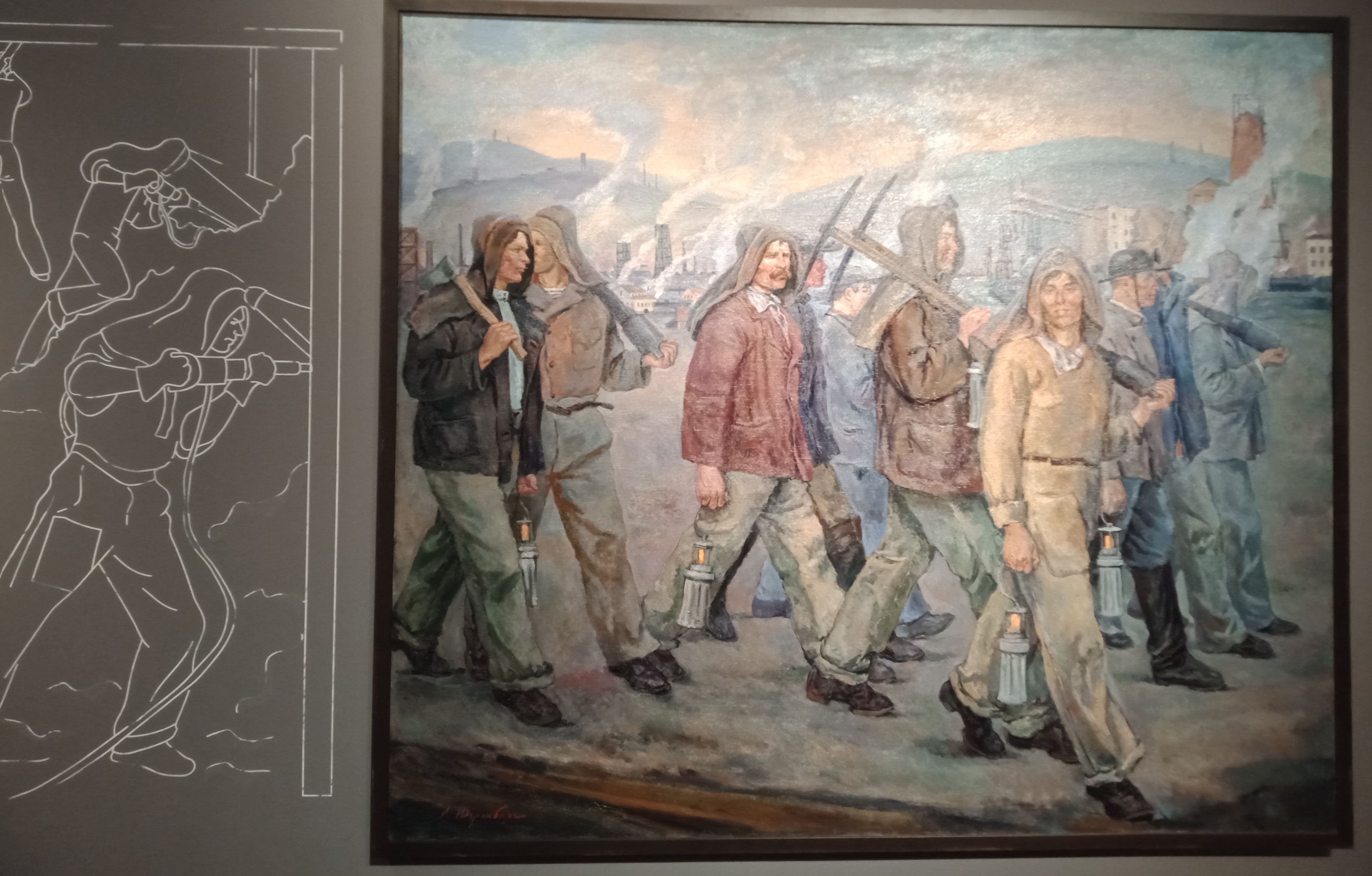 Тесть Юрия Трифонова А. Нюренберг побывал в шахтах Прокопьевска и создал триптих, ему позировали кузбасские ударники-стахановцы Иван Борисов, Роман Мачихин и Мингалей Шакиров. В настоящее время экспонируется только центральная, уже реставрированная часть триптиха. Из индустриальных пейзажей следует отметить "Домну №1" (1931) Петра Котова.