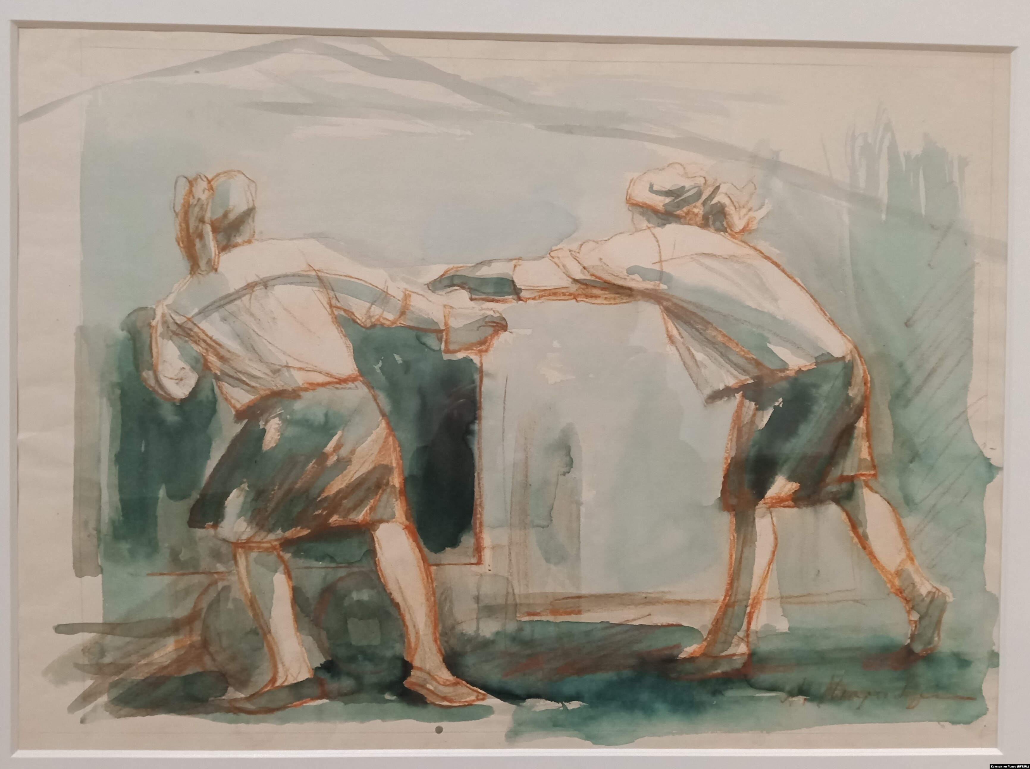 Но в Кузбассе побывали в творческих командировках и советские художницы Сарра Шор и Анна Самойловских, чья графика также представлена на выставке. Ударники пятилеток должны были не только примерно трудиться, но и красиво отдыхать. А художники – не менее красиво запечатлеть часы пролетарского досуга. Этому посвящен идиллический пейзаж Василия Мешкова-мл. "Кемерово" (1937–1938).