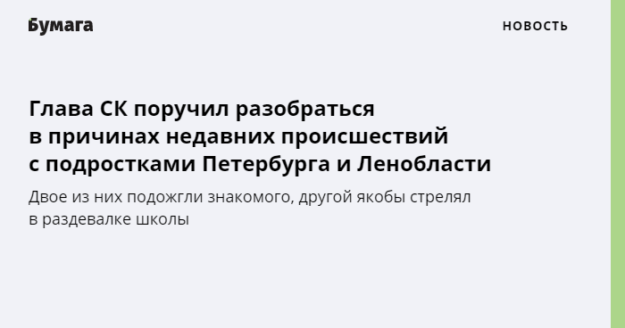 Председатель Следственного комитета РФ Александр Бастрыкин потребовал разобраться в причинах и обстоятельствах трех инцидентов с подростками, которые произошли 9 и 10 апреля в Петербурге и Ленобласти. Об этом сообщает пресс-служба СК.