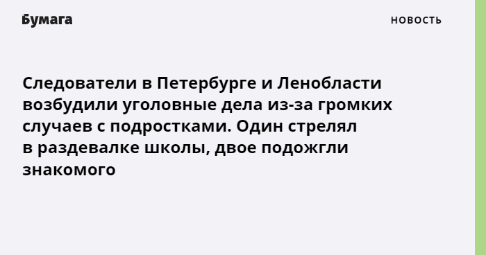 Следственный комитет возбудил уголовное дело о хулиганстве с применением оружия (ч. 2 ст. 213 УК РФ) в отношении 15-летнего ученика школы в Московском районе Петербурга. Уголовные дела возбуждены и по двум другим случаям, на которые ранее обратил внимание глава СК Александр Бастрыкин.