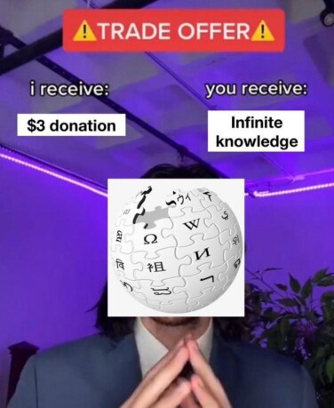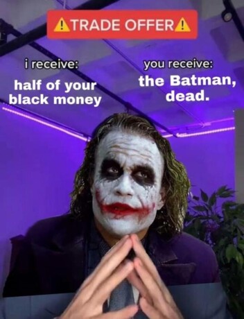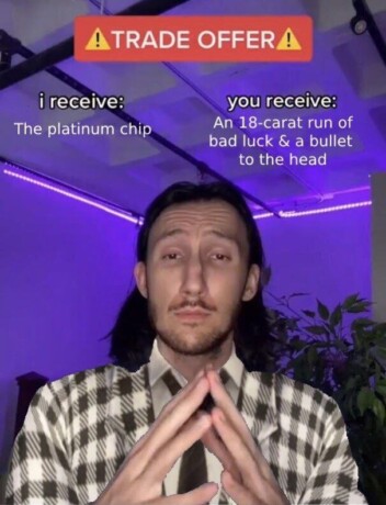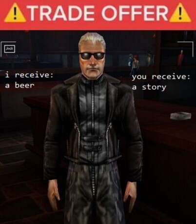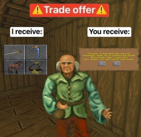 В соцсетях набрали популярность мемы, где пародируют торговлю в видеоиграх: герой шаблона предлагает выгодную только для него сделку, ожидая, что вторая сторона согласится на неравноценный обмен. Порой покупатель оказывается ни с чем, а иногда даже в худшем положении, чем был изначально.