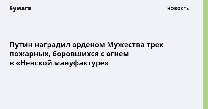 Владимир Путин наградил орденом Мужества петербургских пожарных — одного погибшего и двух пострадавших при тушении пожара в здании «Невской мануфактуры». Указ опубликован на сайте президента. Власти Петербурга выплатят их семьям компенсации.