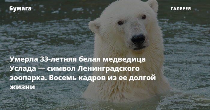 В Ленинградском зоопарке 13 апреля умерла белая медведица Услада. Ей было 33 года, она считалась одной из самых старых представительниц своего вида в мире. Услада была символом Ленинградского зоопарка, за 28 лет жизни там она родила 16 медвежат, которых можно встретить в зоопарках разных стран — от Чехии до Австралии. «Бумага» собрала восемь кадров из долгой жизни медведицы.
