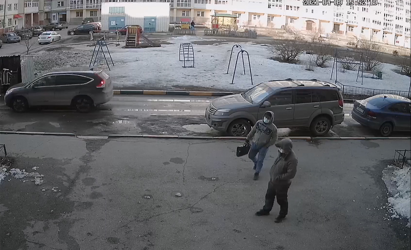 На видео, датированном 9 апреля, в 15:52 в подъезд заходят двое мужчин в медицинских масках. При этом у обоих на лбы надвинуты кепки, а сверху на головные уборы наброшены капюшоны худи и куртки. На видео, снятом уже внутри подъезда, можно рассмотреть, что один из мужчин одет в черные перчатки; в руках у него портфель, из которого торчат два длинных зеленых стебля, предположительно, гвоздик.